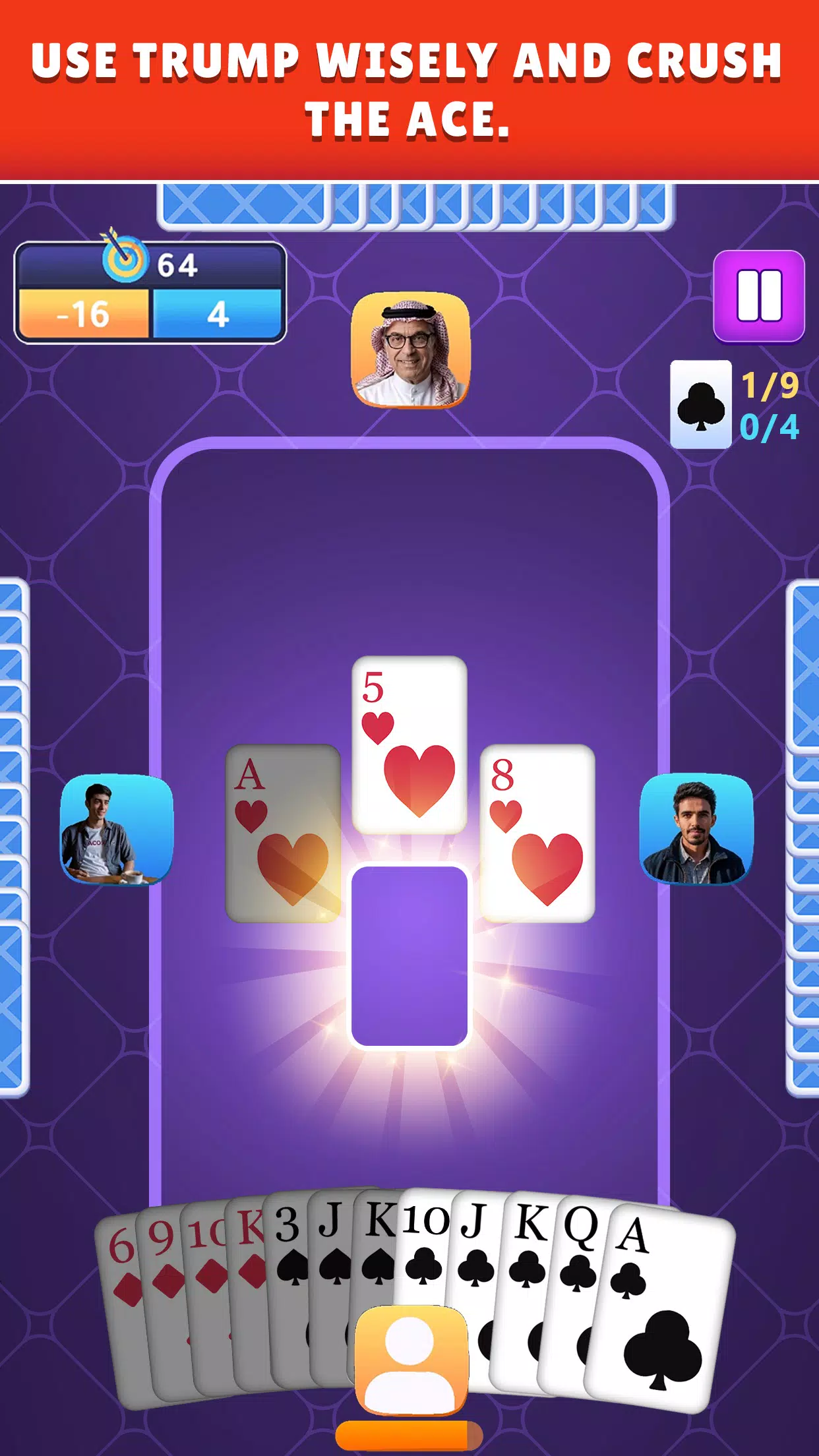 您的胜负取决于您的牌型运气和搭档。这是一款精彩的技巧卡牌游戏,包含将牌和出牌。