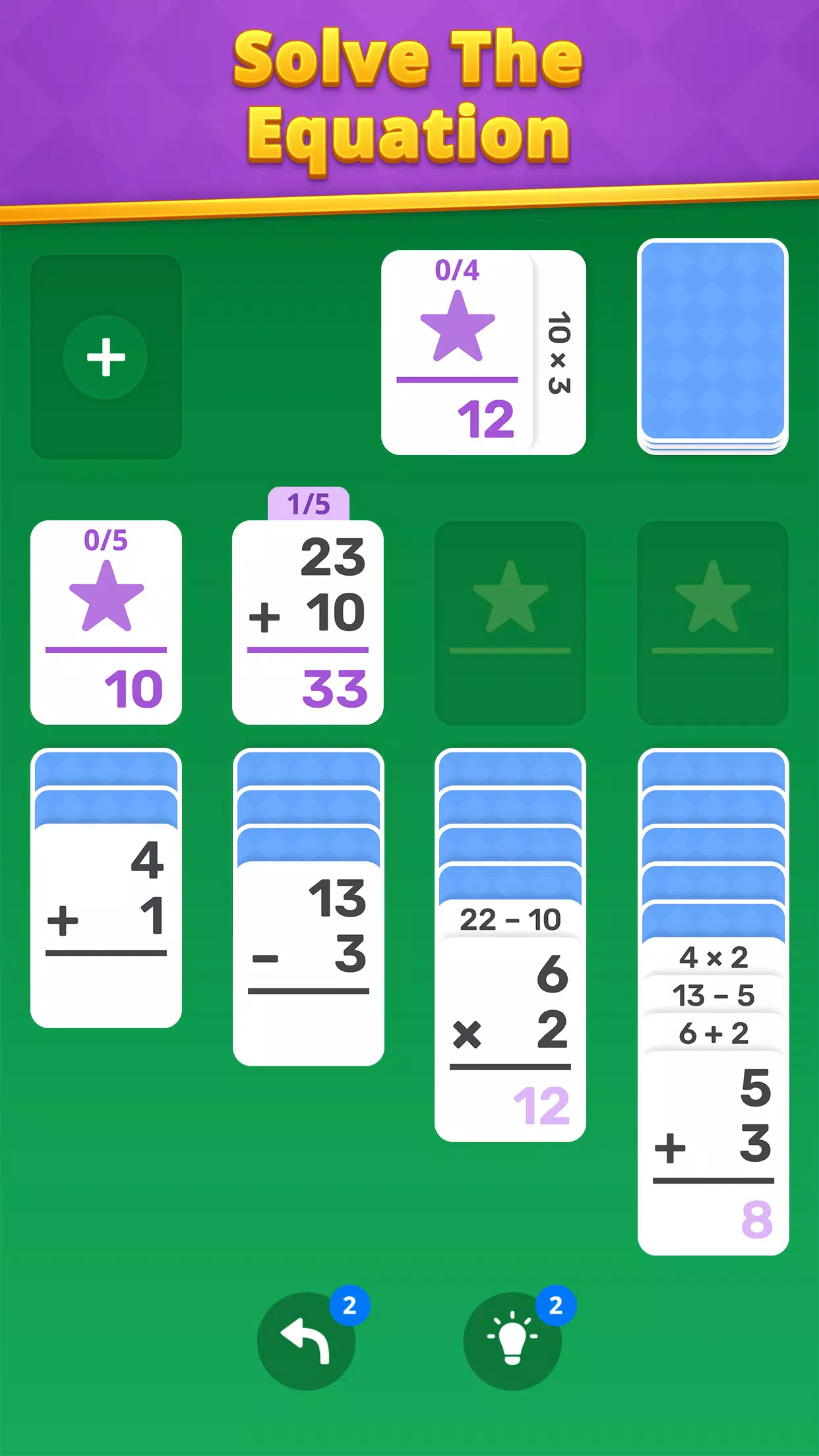 轻松又充满挑战:数学纸牌游戏完美融合了轻松休闲的乐趣和提升脑力的逻辑思维。每个关卡都需要策略性思考、记忆力和计算能力。在享受经典纸牌游戏的同时,体验解方程的成就感,一切尽在你的掌控之中。