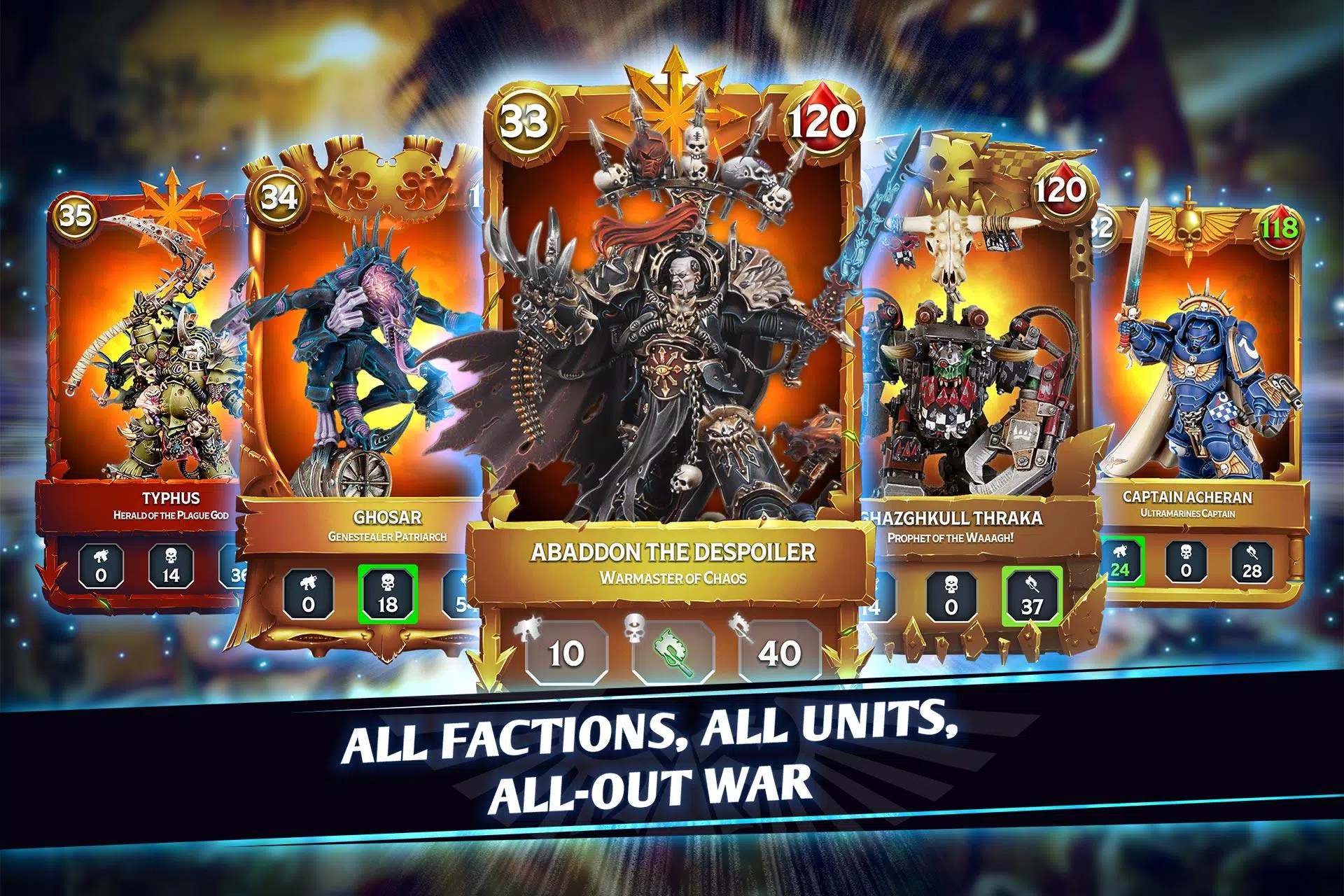 • 战术卡牌对战:构建你的战锤战斗卡牌 – 40K 卡牌,与其他玩家在卡牌对战中决一死战。你会干掉他们的保镖,还是直接挑战军阀?