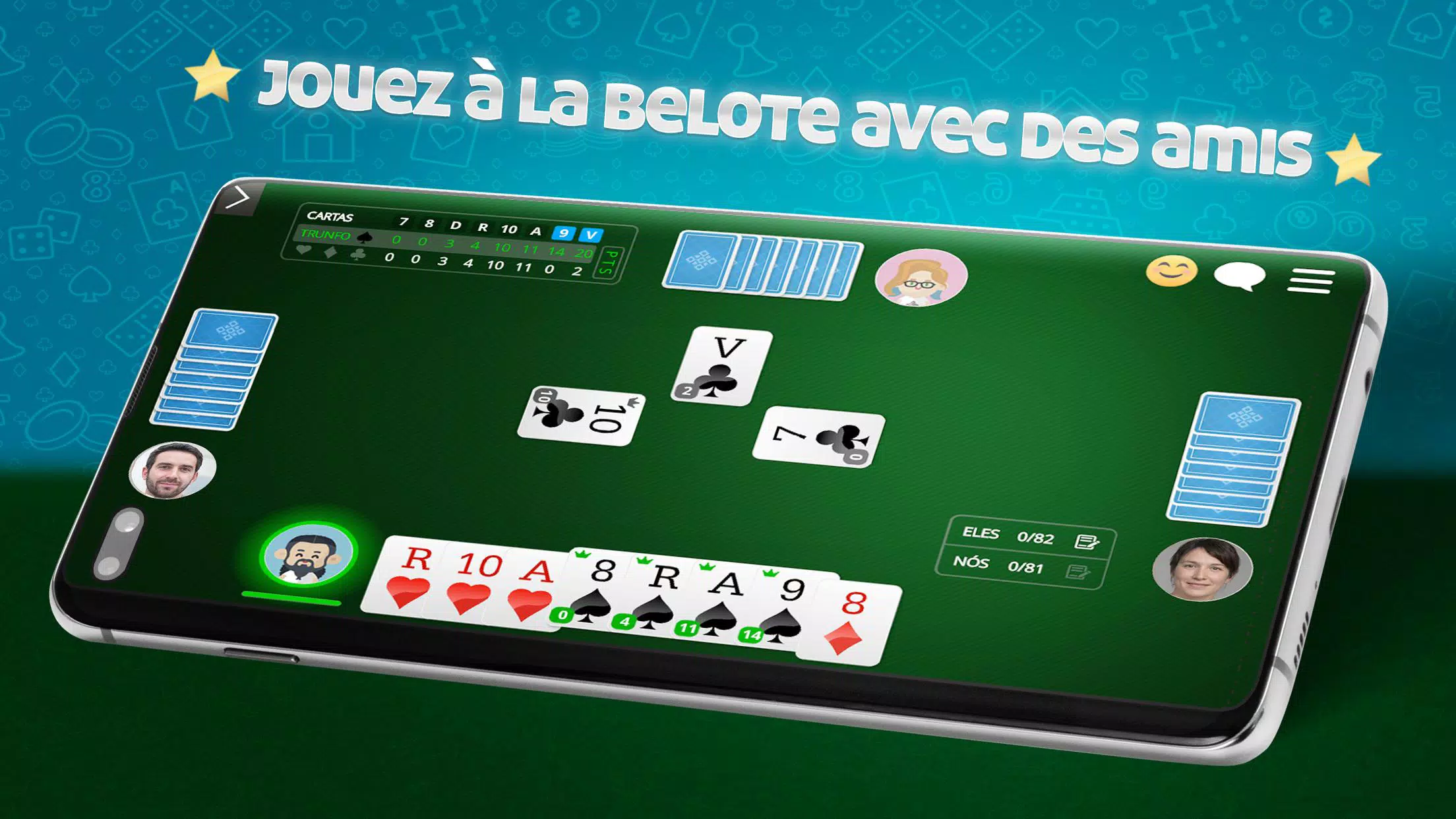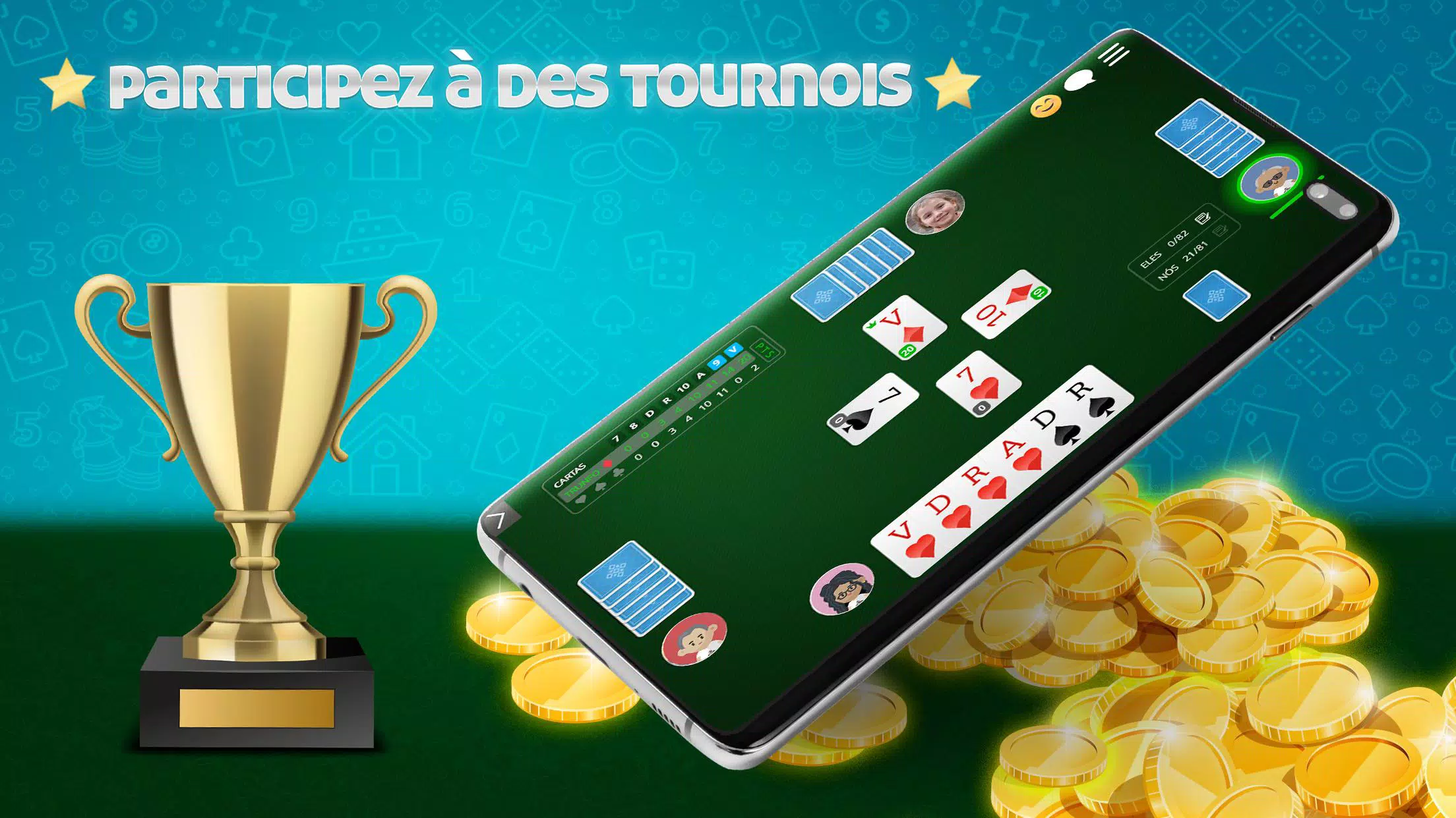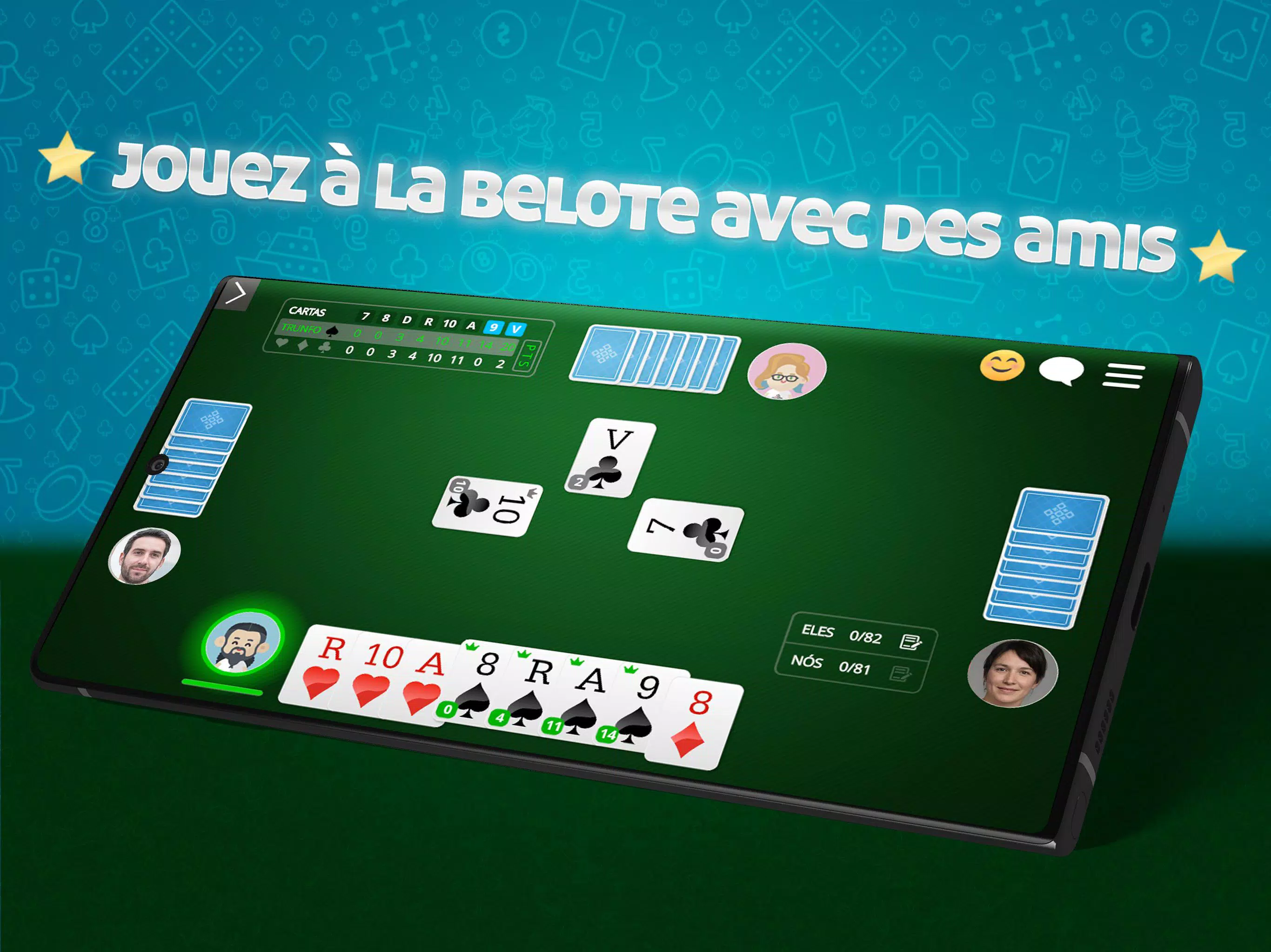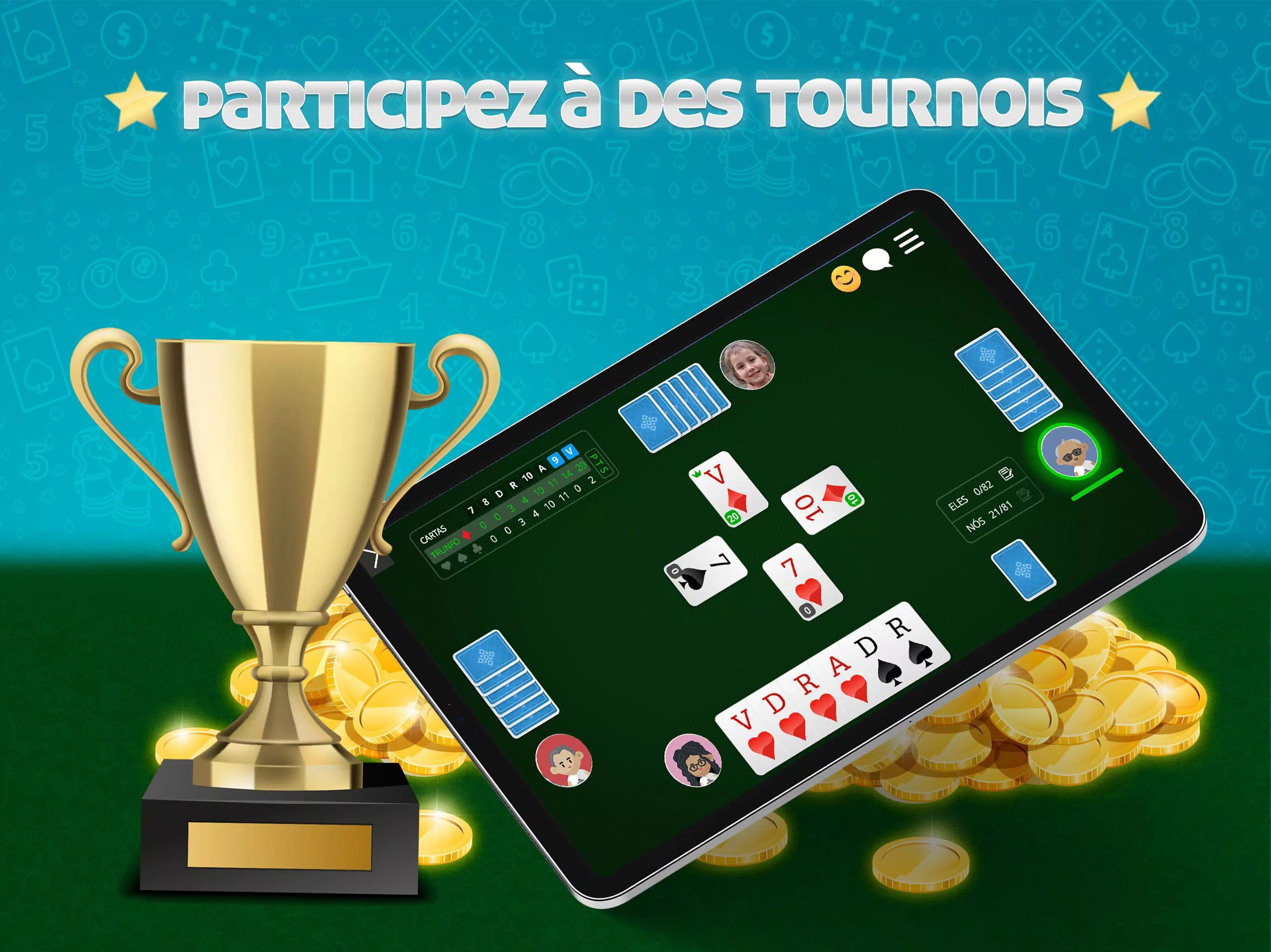 最佳游戏 Belote Online 🇫🇷,流行的法国纸牌游戏。与数百名法国玩家免费玩多人游戏。下载该应用程序并立即播放! 免费玩Belote,无需注册 资源: ●硬币下注比赛 ●与朋友在线玩或在计算机上玩 ●游戏规则了解如何在线玩Belote ●适合不同级别玩家的休息室 ●多人或独奏模式 ●每日,每周,每月和每年的排名 ●参加比赛并赢得特别奖杯 ●检查游戏中的统计 在线Belote🇫🇷是免费的ClubDeJeux应用程序,面向发卡爱好者和专业人士!