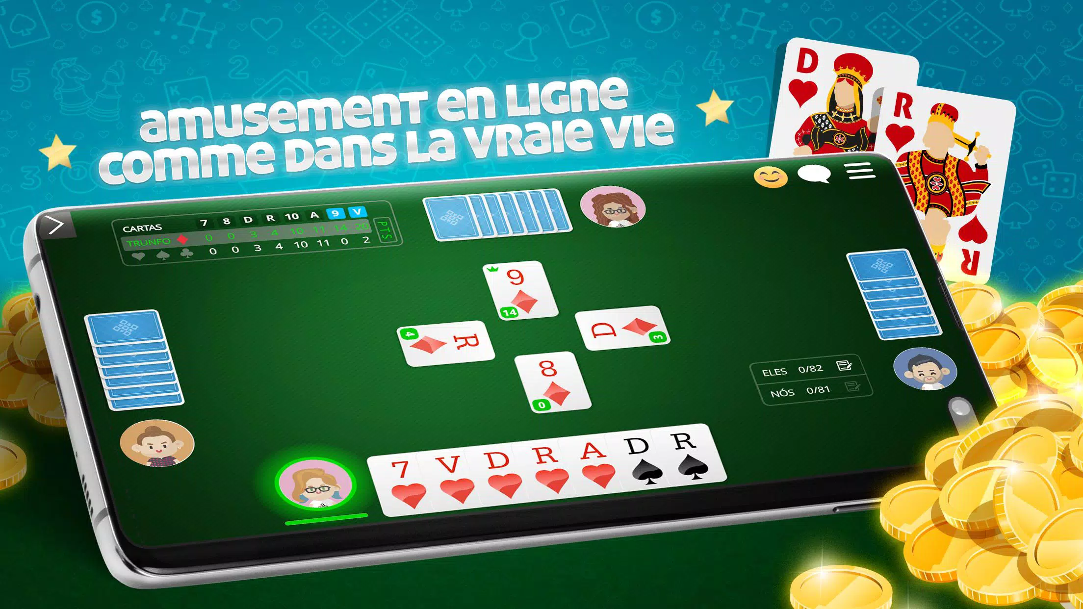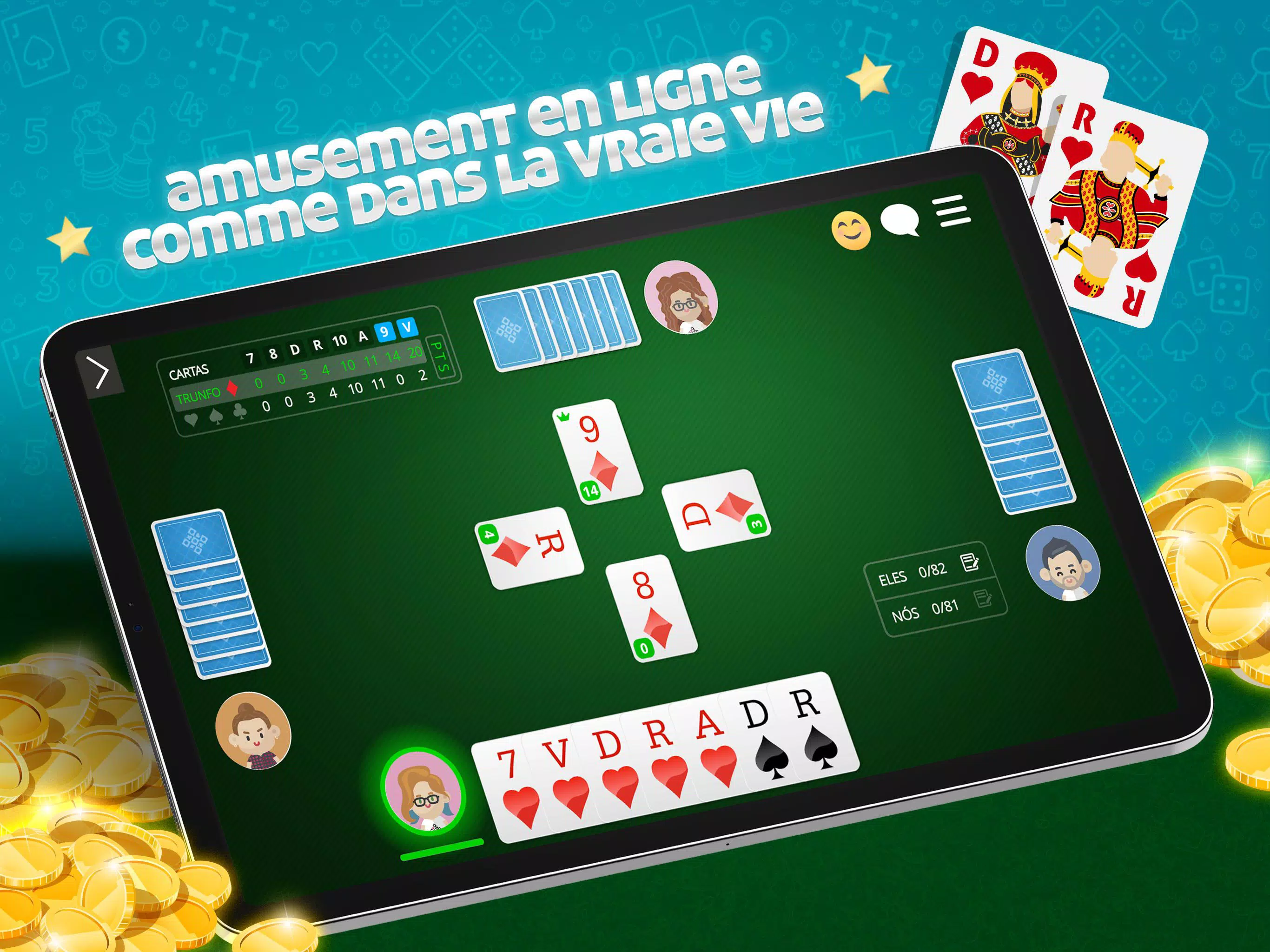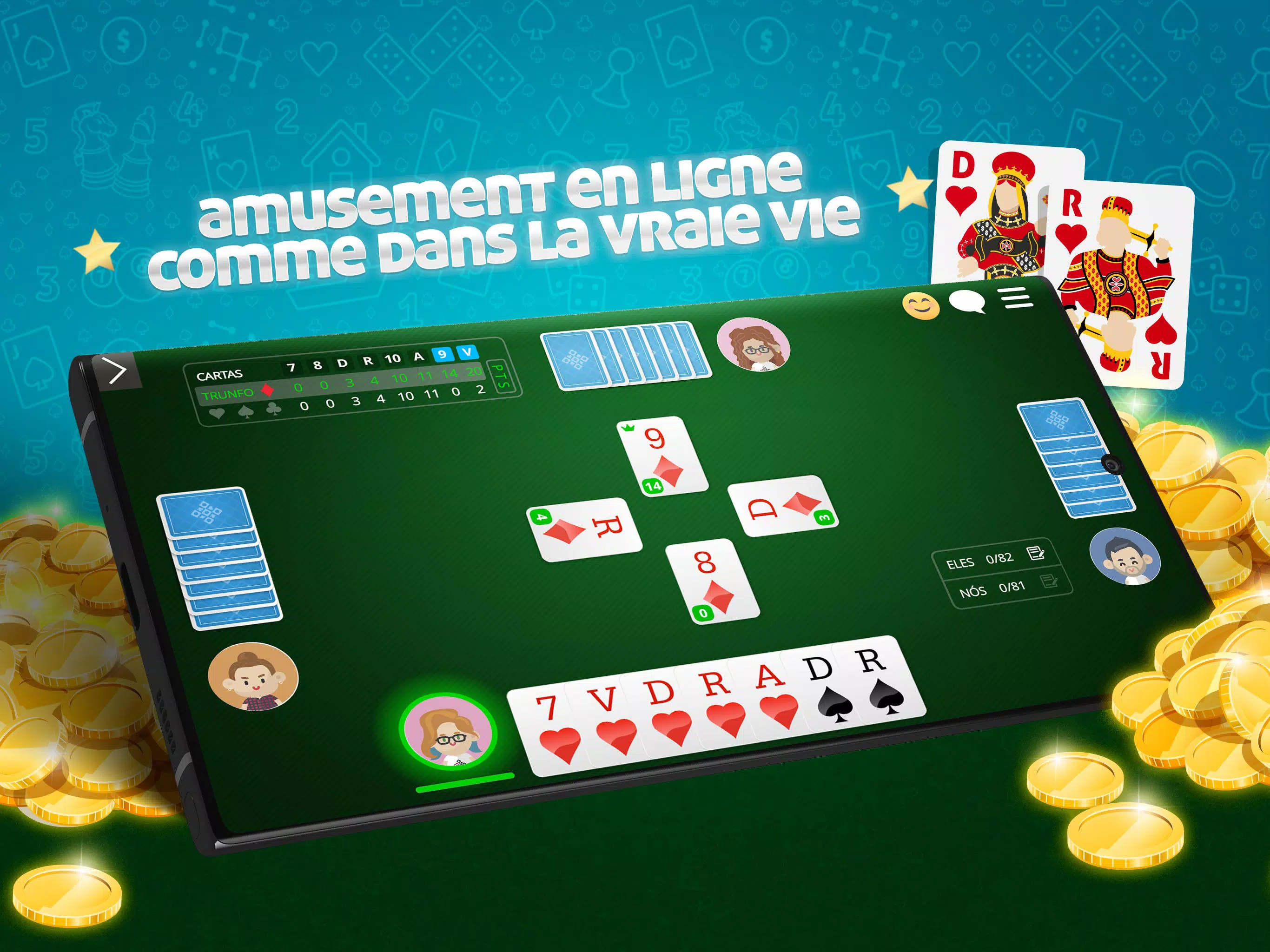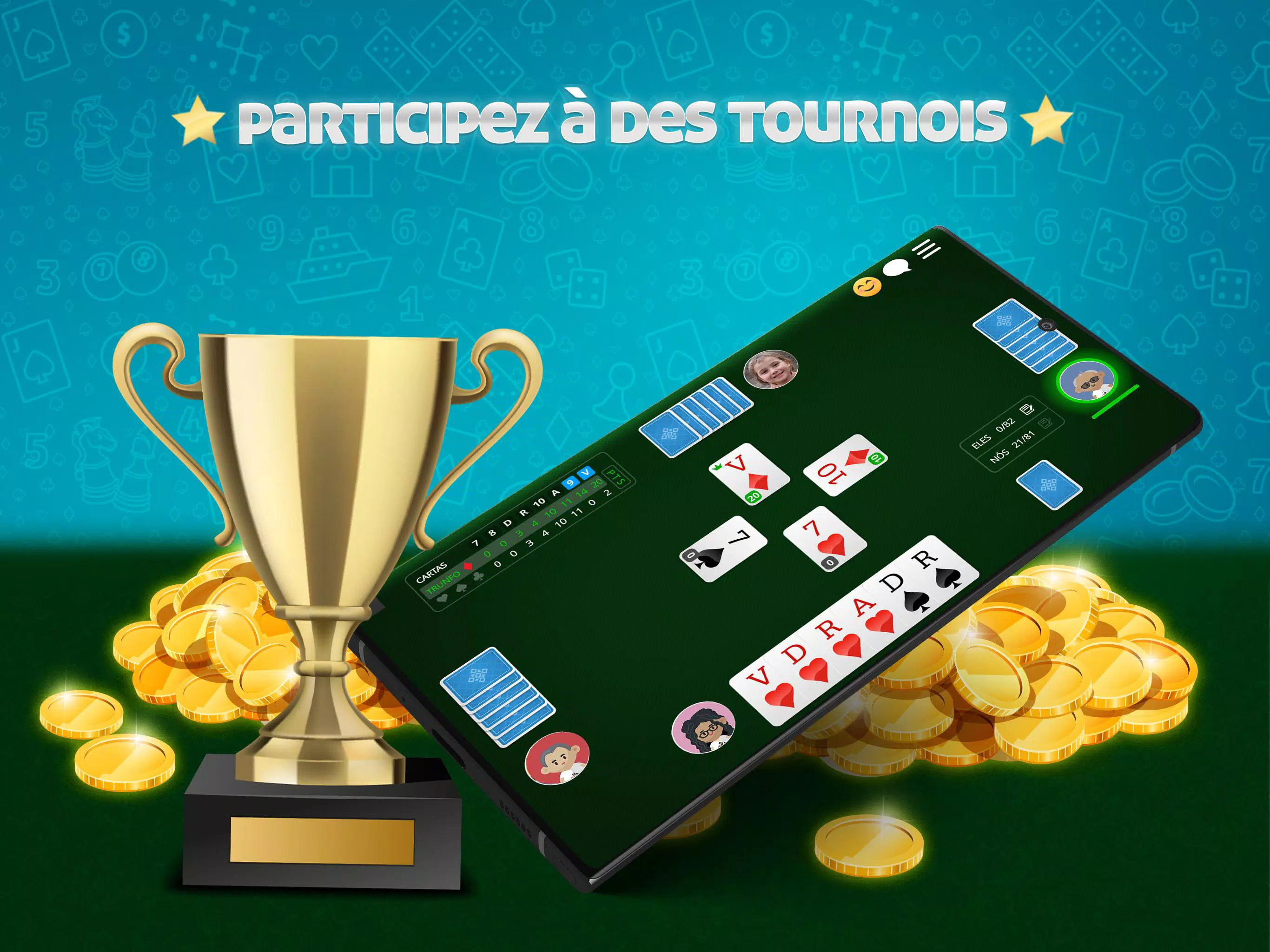 最佳游戏 Belote Online 🇫🇷,流行的法国纸牌游戏。与数百名法国玩家免费玩多人游戏。下载该应用程序并立即播放! 免费玩Belote,无需注册 资源: ●硬币下注比赛 ●与朋友在线玩或在计算机上玩 ●游戏规则了解如何在线玩Belote ●适合不同级别玩家的休息室 ●多人或独奏模式 ●每日,每周,每月和每年的排名 ●参加比赛并赢得特别奖杯 ●检查游戏中的统计 在线Belote🇫🇷是免费的ClubDeJeux应用程序,面向发卡爱好者和专业人士!