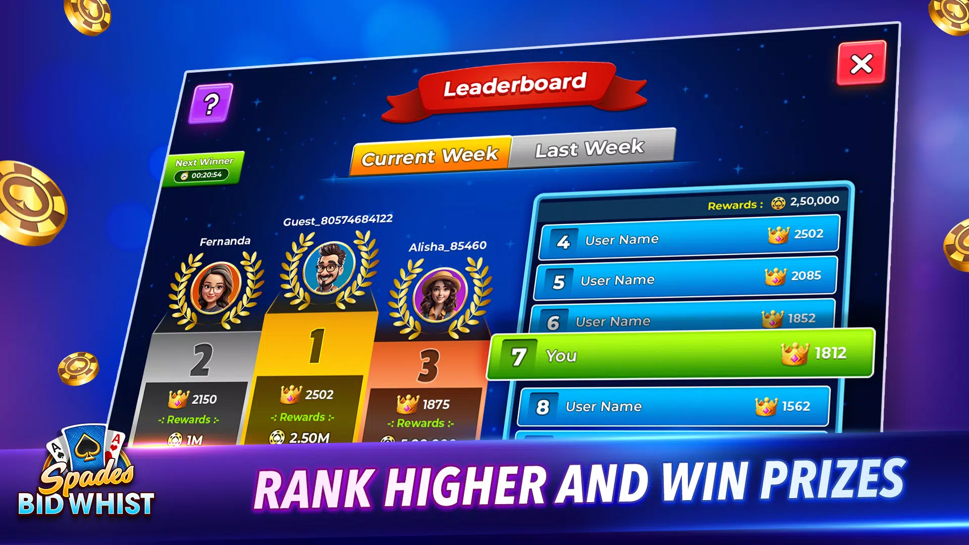 🏆精彩锦标赛和排行榜:参加定期锦标赛,挑战自我,攀登全球排行榜。无论您的目标是成为我们免费在线惠斯特牌游戏的冠军,还是称霸黑桃牌游戏,每一场比赛都至关重要!