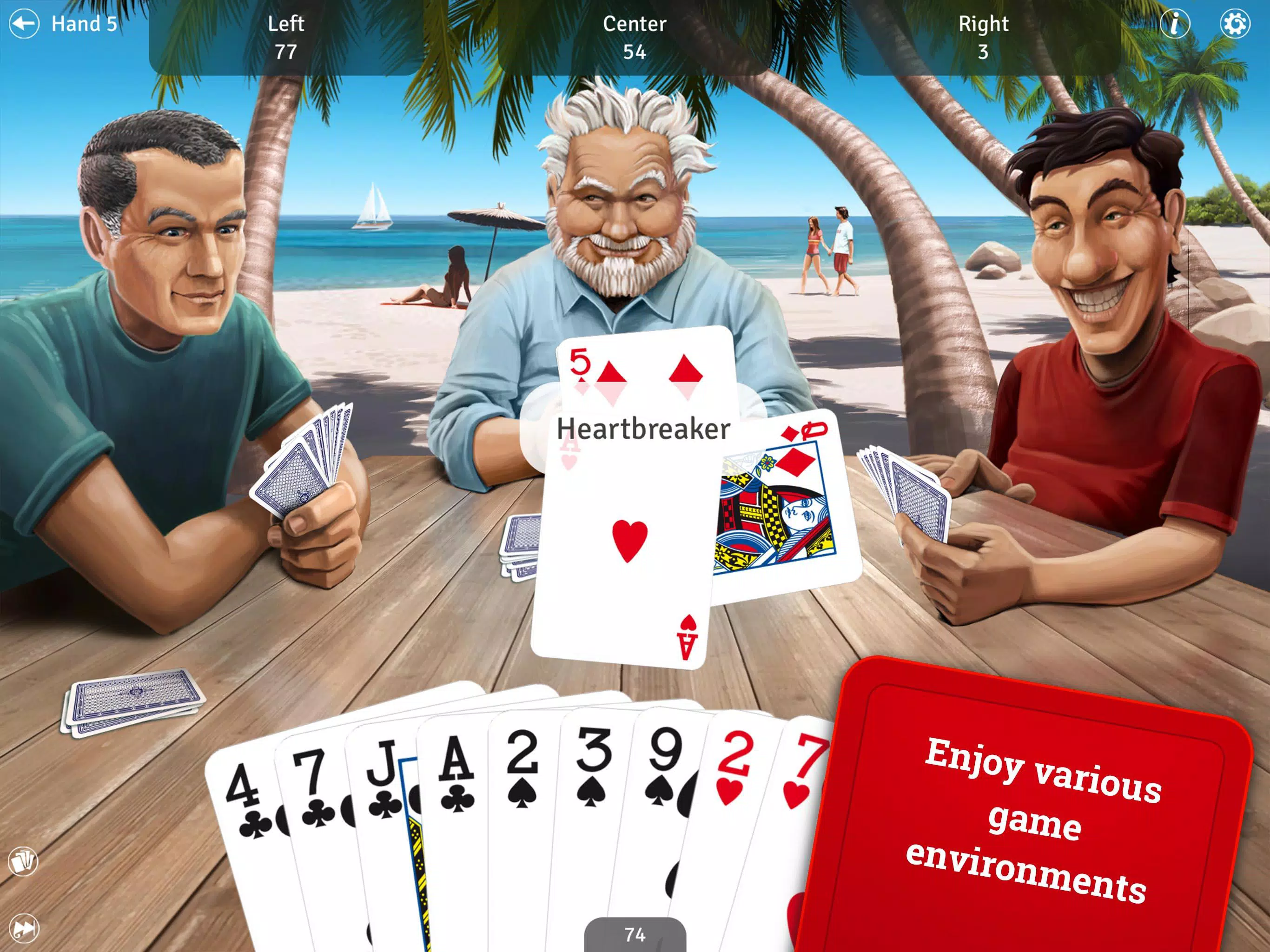 – 提供辅助功能,帮助新手轻松享受红心大战的乐趣:撤销、提示、红心大战规则。