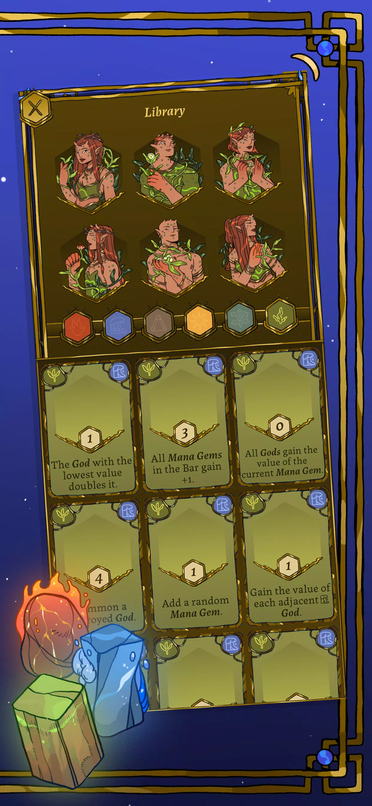掌控6个元素神灵阵营(火焰、流水、林木、沙漠、岩石和冰雪)的力量,每个阵营都拥有独特的卡牌和技能。策略性地抽取并放置你的神灵,最大化它们的分数,连锁强力组合技,激活6颗元素能量水晶获得大量分数加成。