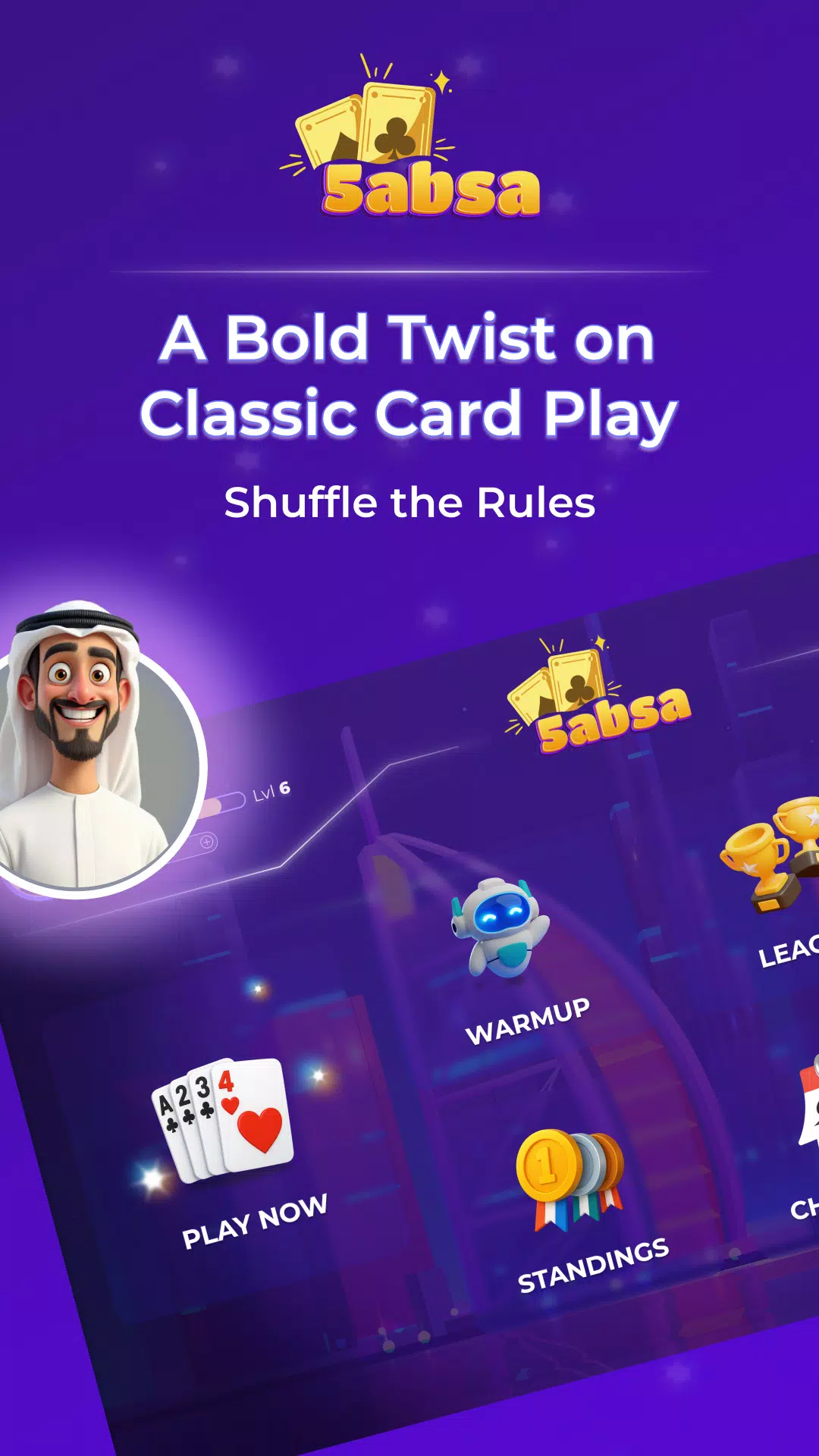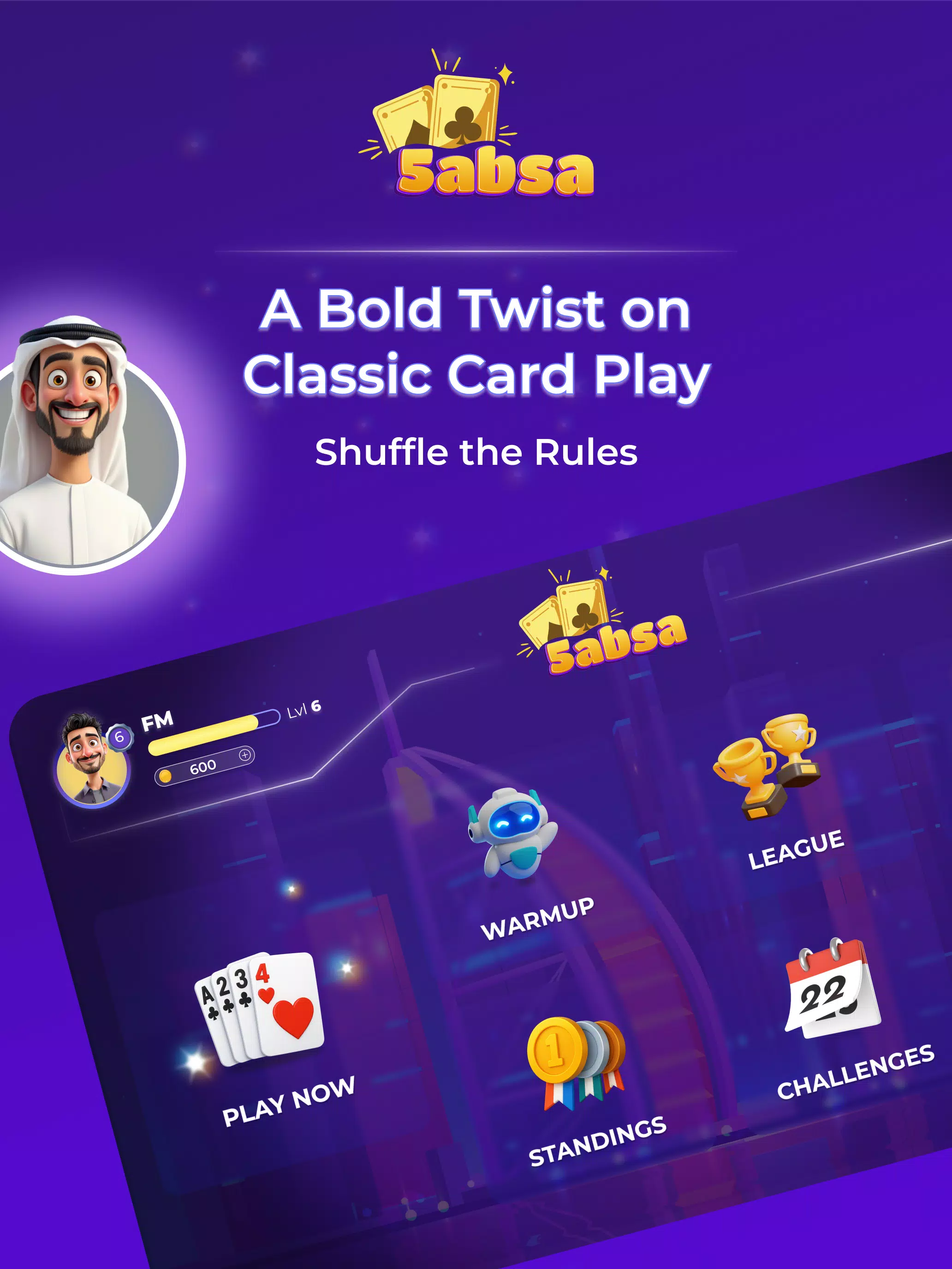 在阿拉伯俚语中,“5absa”意为“洗牌”。这正是我们所做的:颠覆了旧的规则,为您带来全新、极具竞争力的 Tarneeb 版本,专为快速匹配、战略深度和无尽的炫耀权而设计。