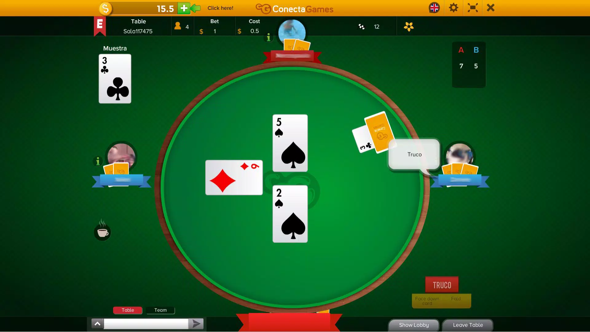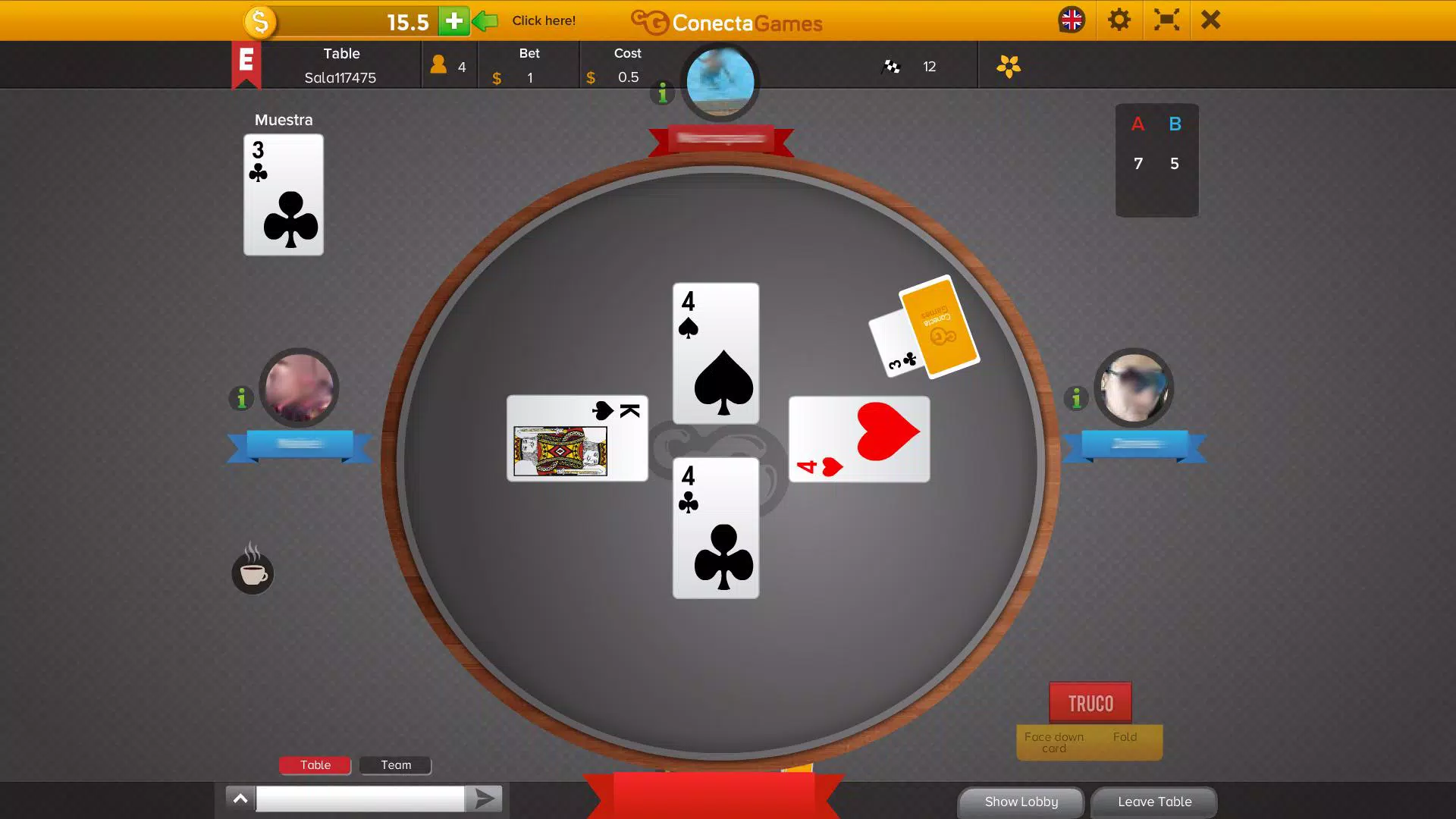 目标是率先达到12分。每位玩家发3张牌。掷出最高牌的玩家赢得该墩,三墩中最好者获胜。该墩的分数取决于双方商定的“gritos”(“Truco”、“Vale 6”、“Vale 9”和“Partido”)。