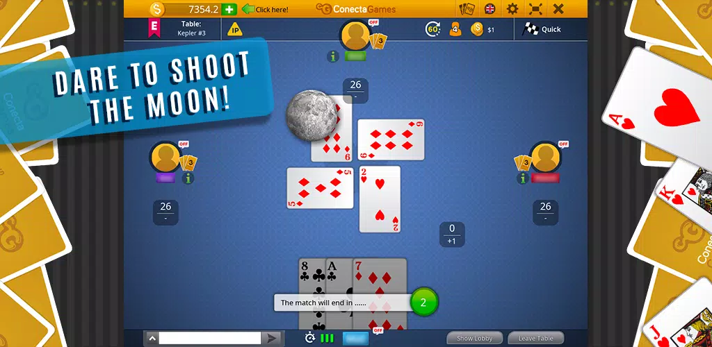 如果你赢得所有得分牌,你可以选择“射月”(Shooting Moon),在这种情况下,你的分数会减少26分,或者你可以选择让所有其他玩家的分数增加26分。