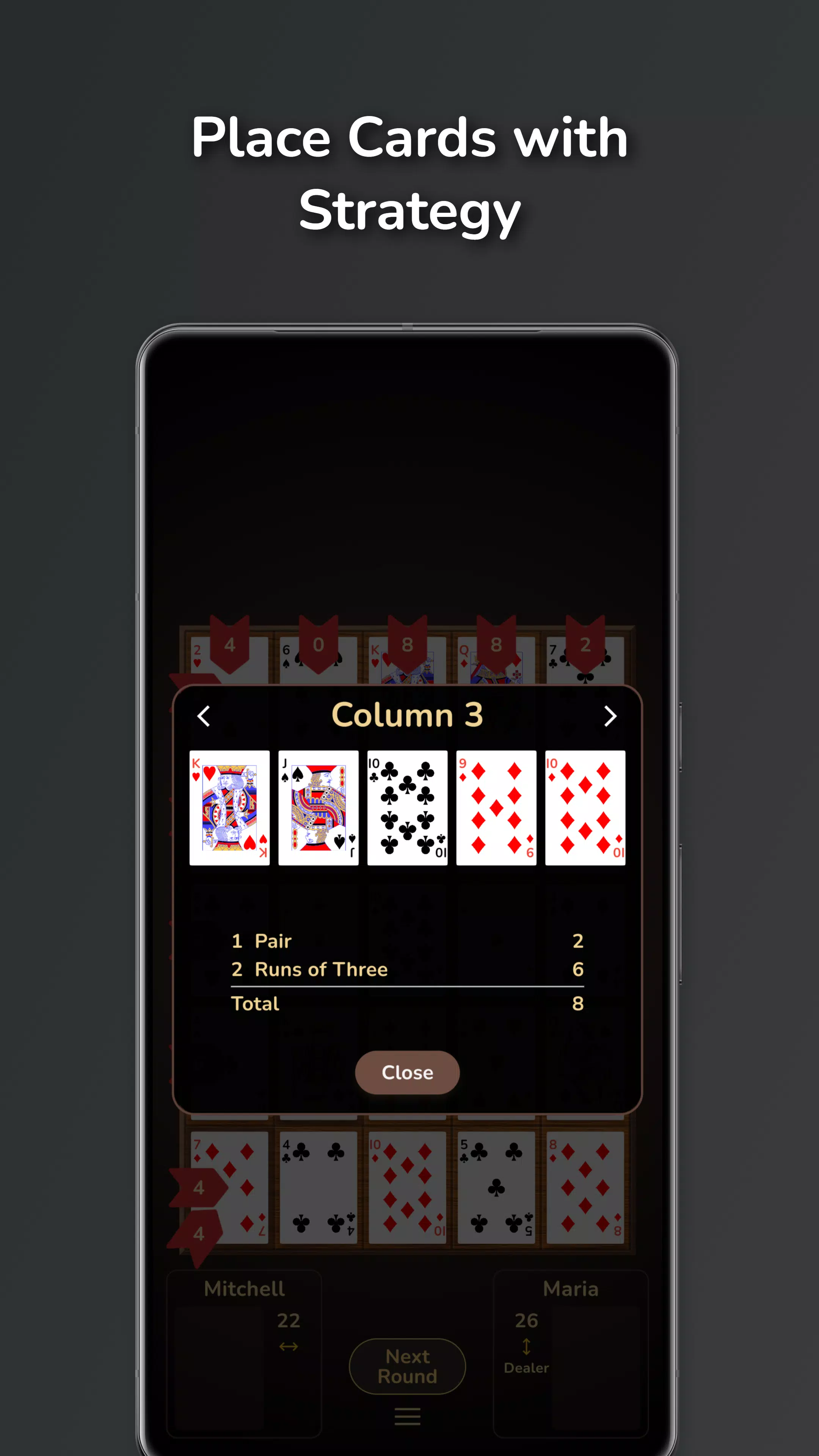 ✔ 策略性地放置牌——每一步都会影响多个牌型。