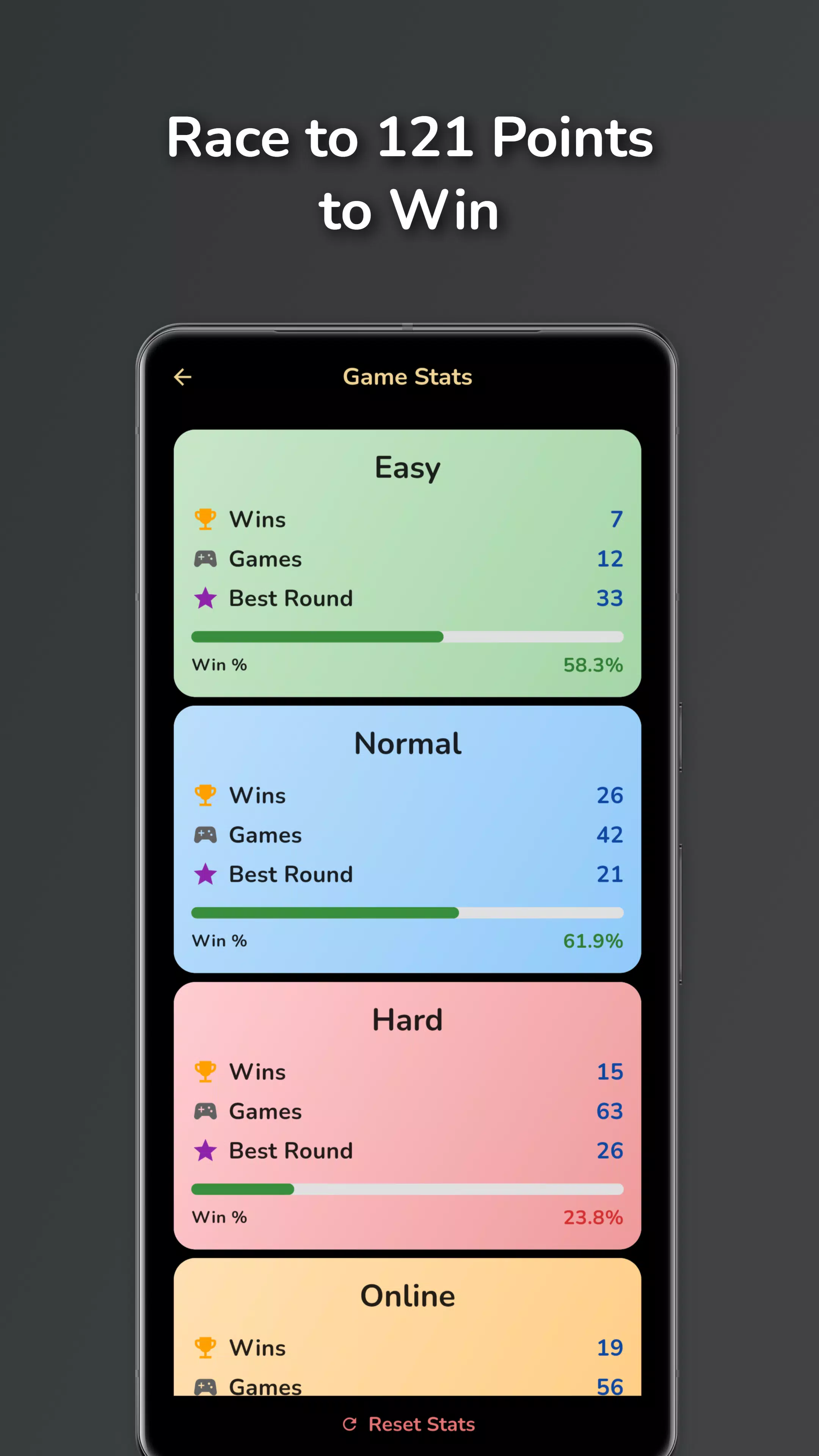 当一名玩家达到 121 分时游戏结束;或者,如果双方玩家在同一轮中均超过 121 分,则得分较高者获胜。