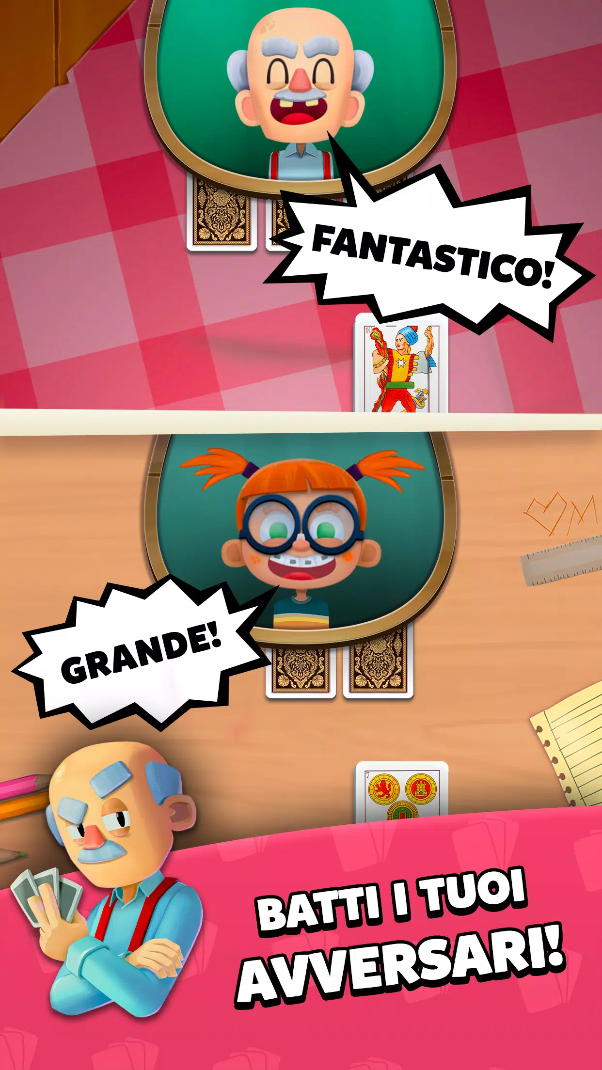 您可以独自免费畅玩传统的Briscola游戏,也可以挑战趣味十足的原创表情包角色,它们现在比以往更大更搞笑!