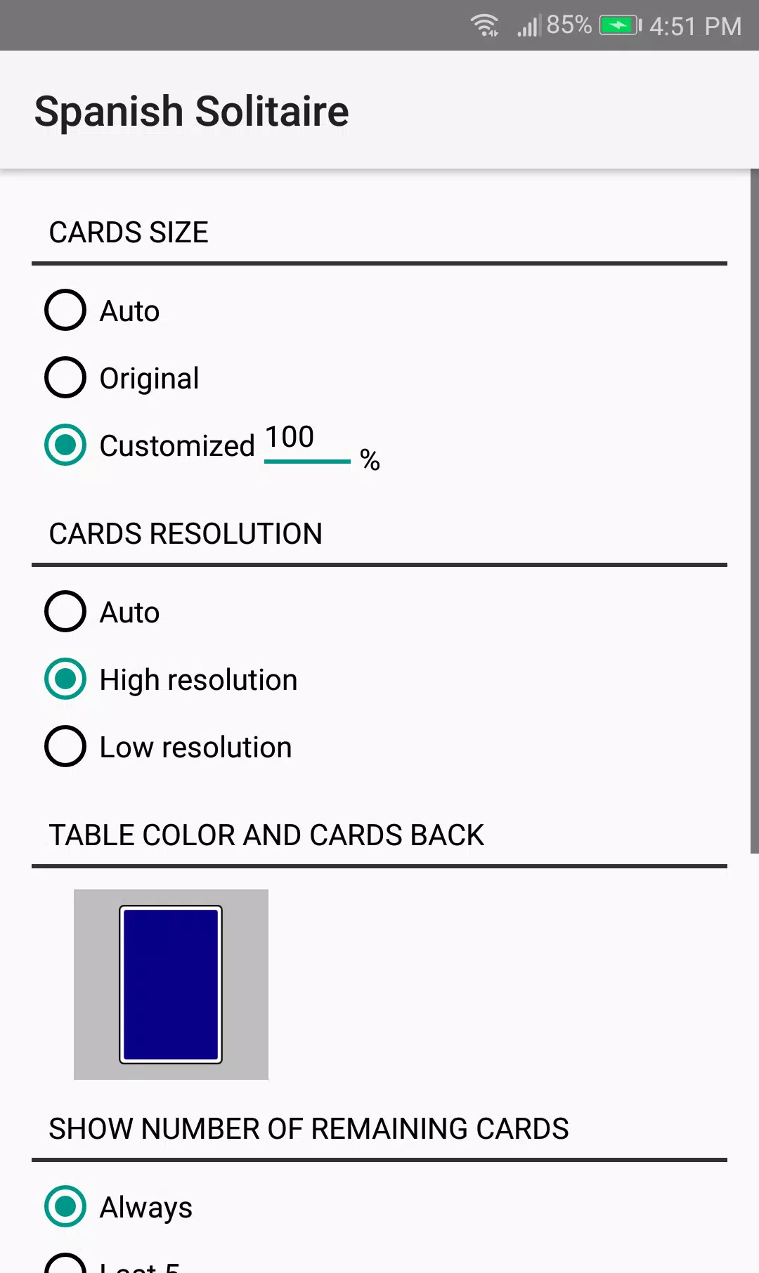 – 设置:纸牌大小和分辨率、纸牌背面颜色、声音、计分牌、牌桌和分数颜色、牌张大小、纸牌移动方式(单击、双击等)