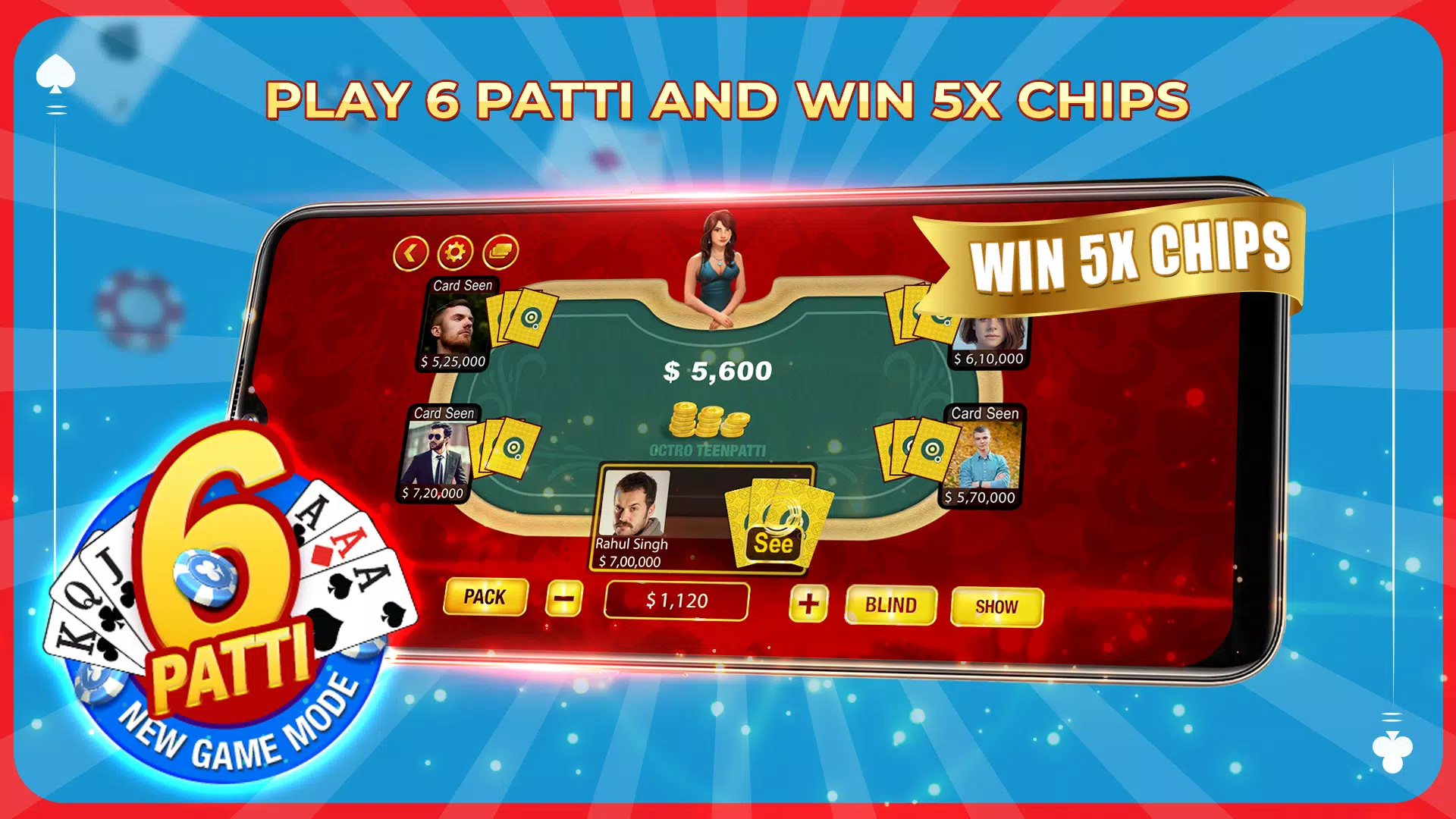 ♣ 6 PATTI : 6 Patti is a tinpatti tournament mode where 15 hands are played between 5 players. Online Teen Patti Winnings are 5 times the stakes.