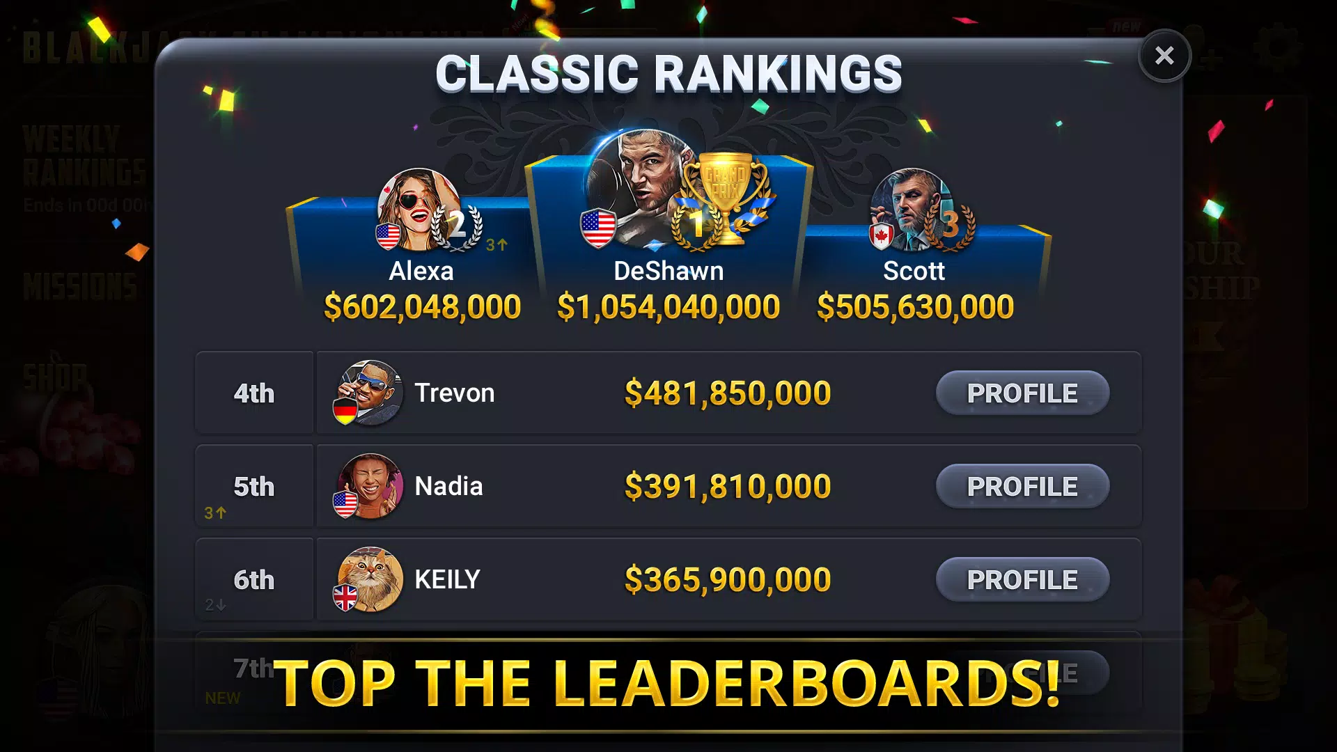 • 每周排行榜:实时与全球顶尖二十一点玩家较量,角逐世界冠军!