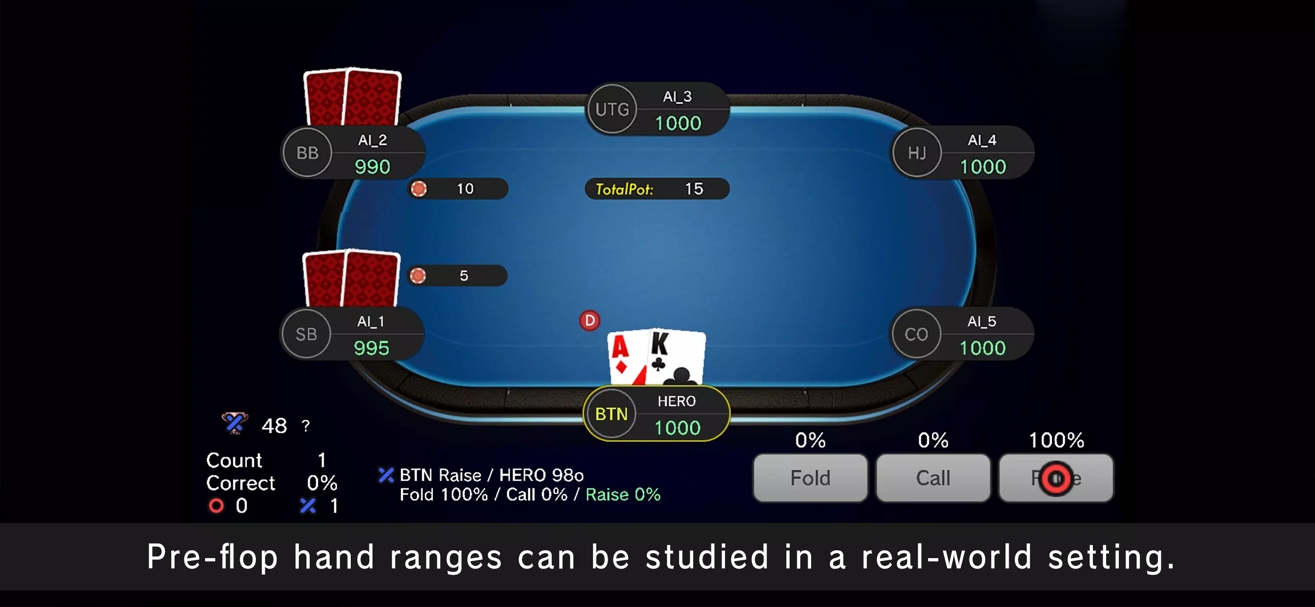 这款应用可让您以真实的游戏形式学习翻牌前手牌范围。