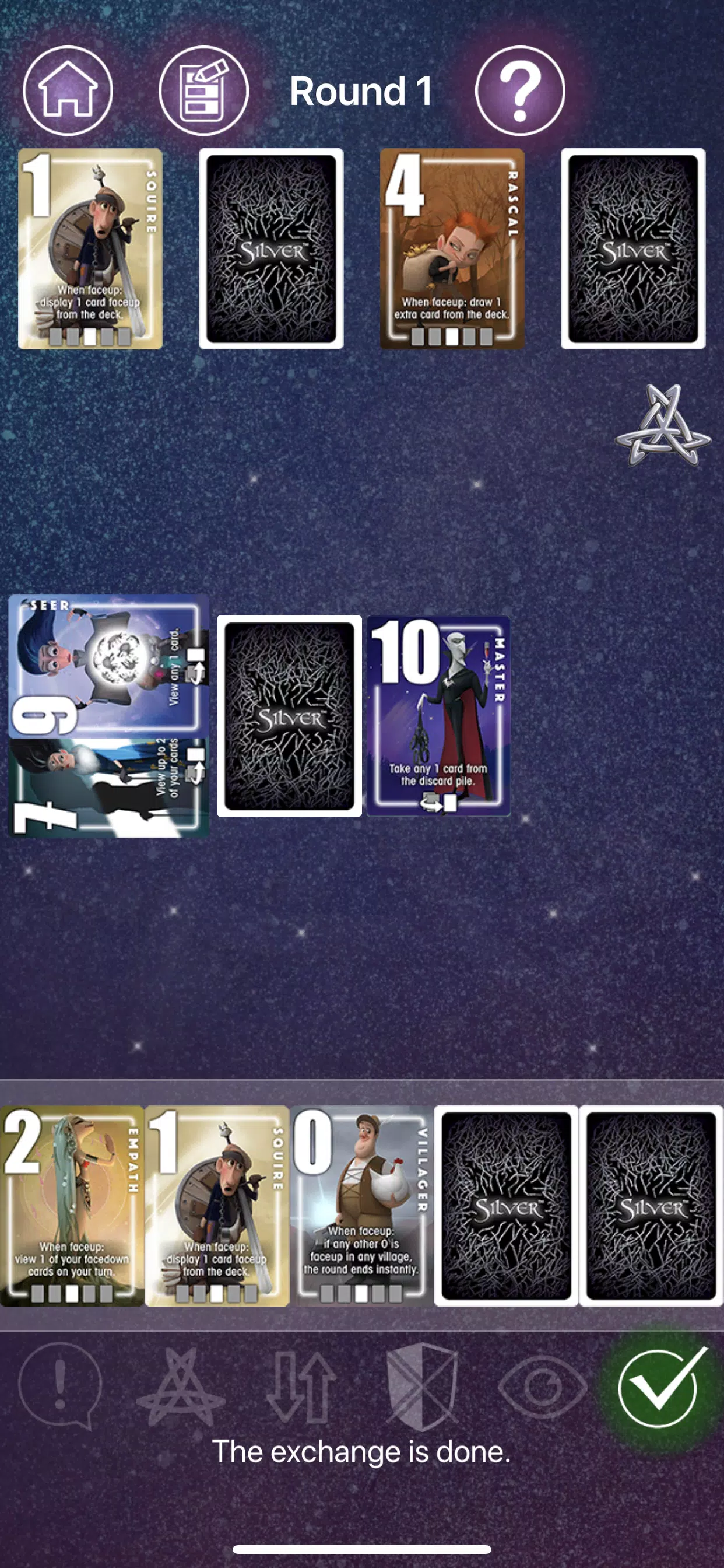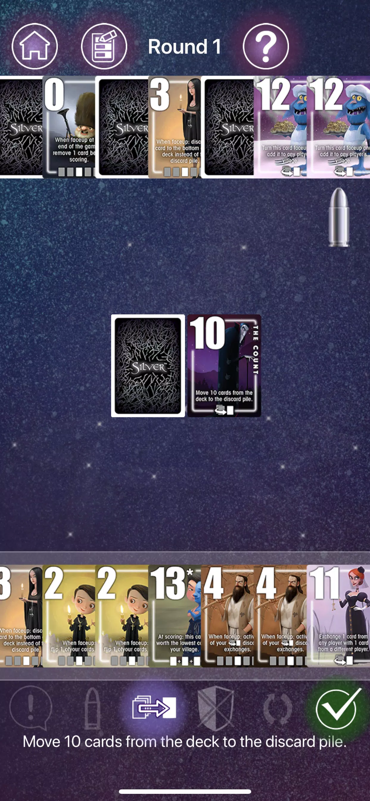 您的白银目标很简单:在四轮结束时获得最低的总和。要实现这一目标,请使用您抽出的卡牌以及村庄中已经面朝上的卡牌中的能力,该村庄由五张卡牌组成。您可以交易匹配的卡牌,也可以将您的卡牌换成您抽到的卡牌以进行匹配或降低您的分数。如果您认为您通过要求投票获得的总和最少,则提前结束一轮;如果你猜对了,你得 0 分,并在下一轮使用 Silver Amulet of Protection 或 Silver Bullet。如果你错了,你会得到你的牌的总和加上十分!