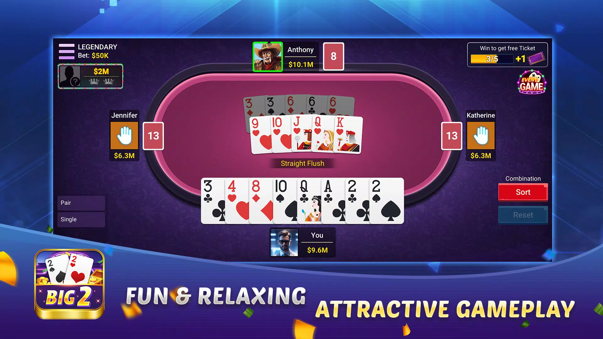 Big 2 节奏明快,策略性强,既能带来轻松的娱乐体验,又能考验玩家的决策能力。
