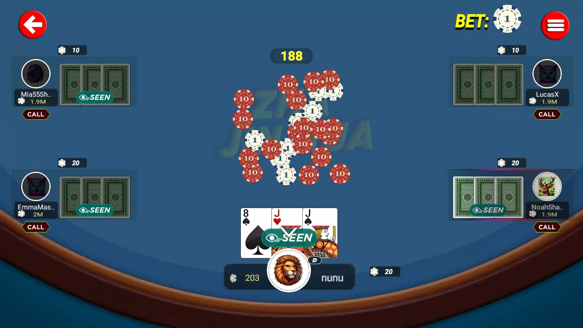 – 可选择 盲注(Blind) 或 看牌(Seen),影响下注倍数与策略方向。