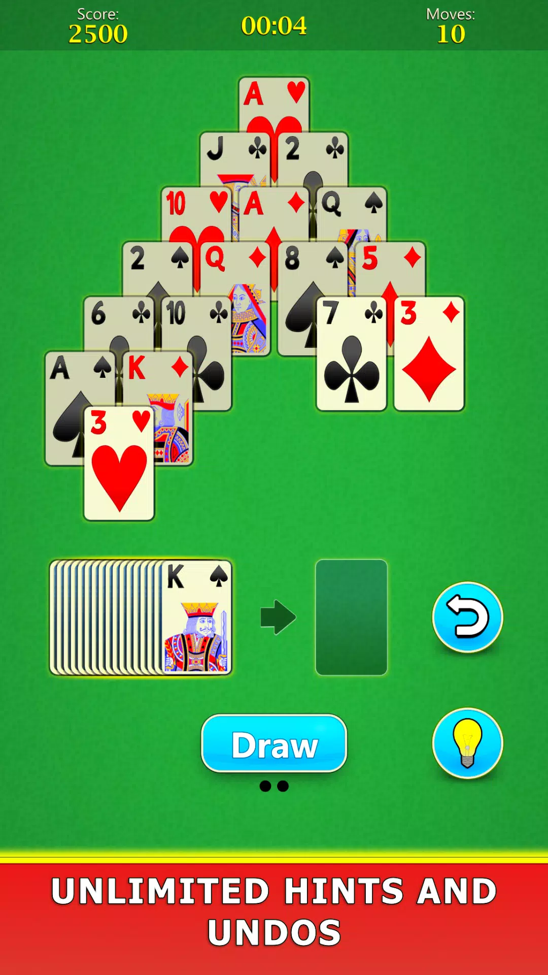 – 牌局上有一个牌堆金字塔和一叠牌,您可以从中抽牌。如果没有匹配的牌,您可以继续从牌堆中抽牌。