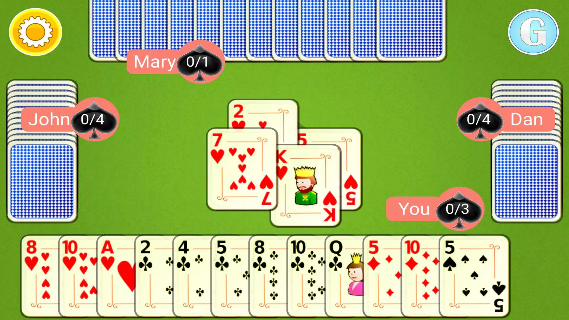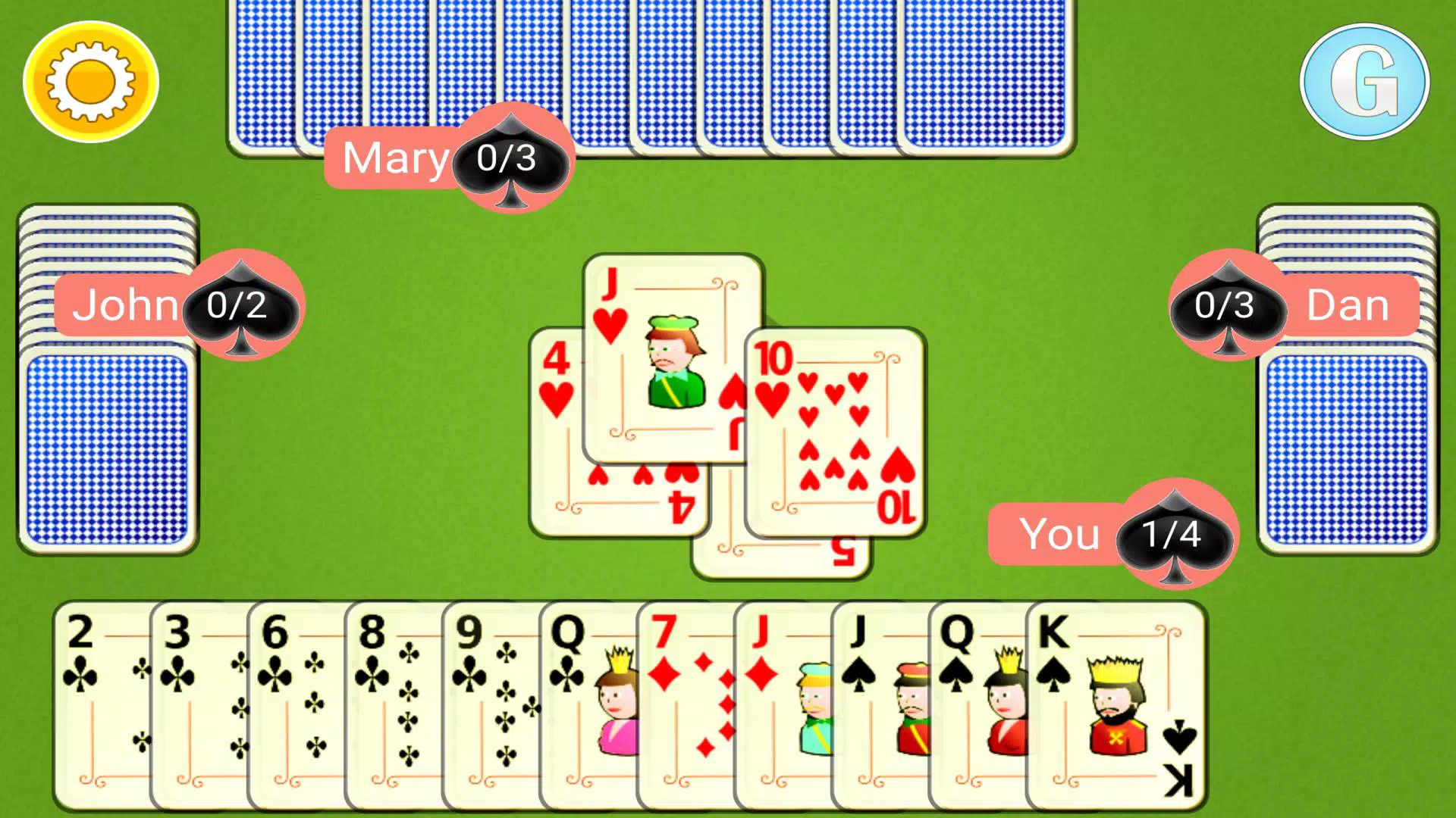 黑桃移动版是一款非常流行的吃墩牌类游戏。游戏的目标是至少赢得每手牌前叫牌的墩数。游戏以团队形式进行,黑桃为王牌。你的搭档坐在你面前,按顺时针方向发牌。如果你和搭档赢得的墩数与你们共同叫牌的墩数相同,你的团队每赢得一墩牌可获得 10 分。如果你的团队赢得的墩数少于叫牌的墩数,你每赢得一墩牌将失去 10 分。为了获胜,你需要尽可能多地得分。