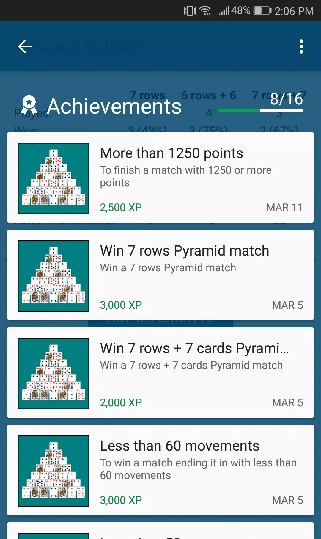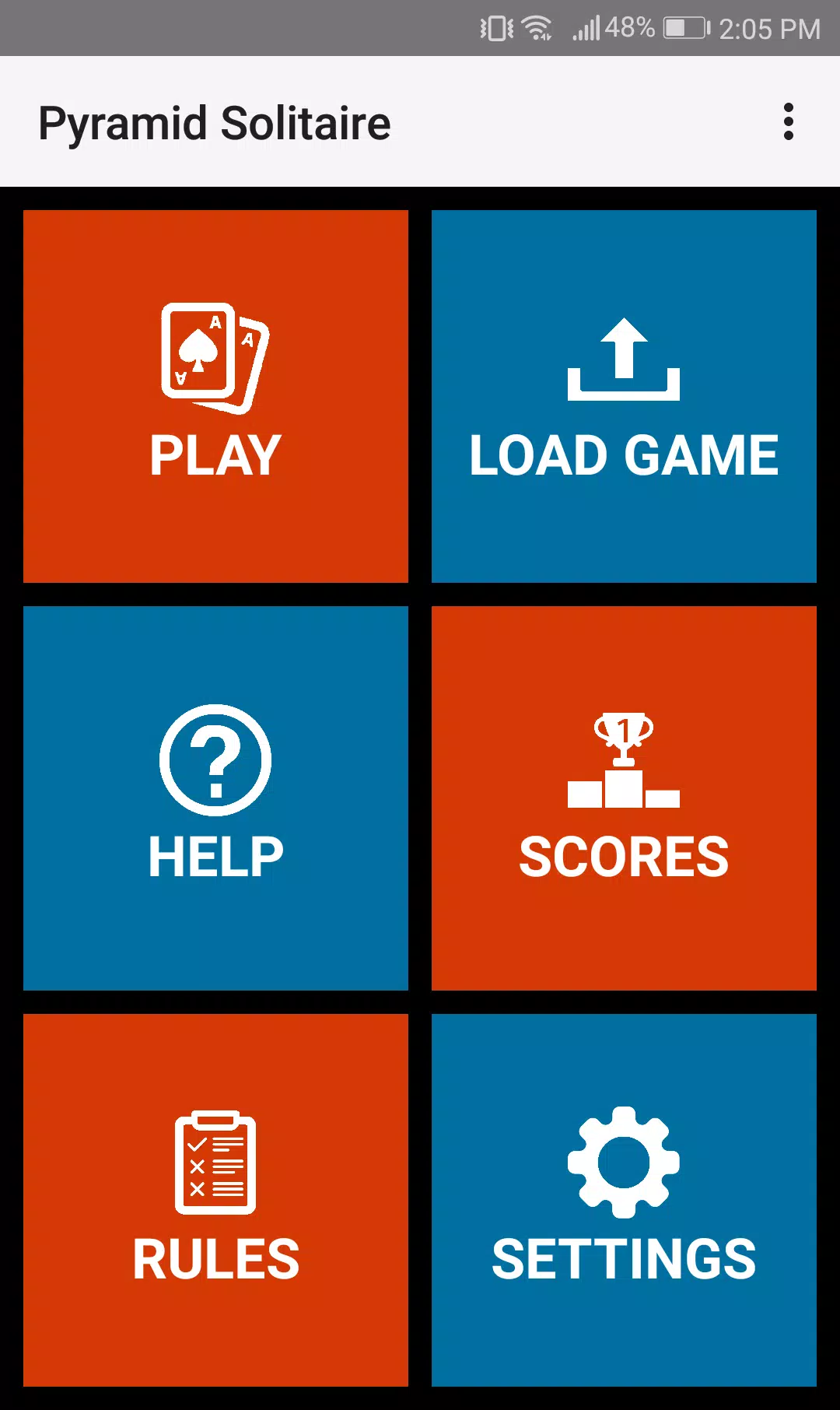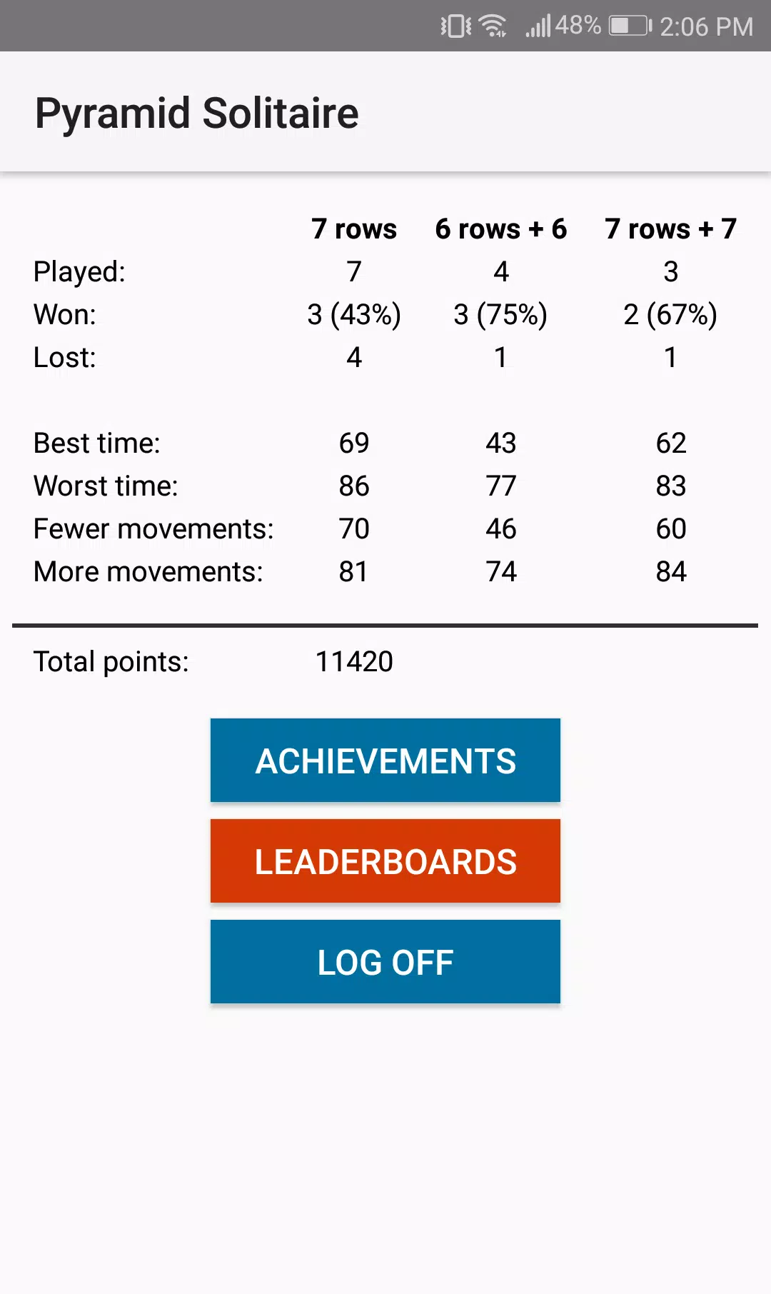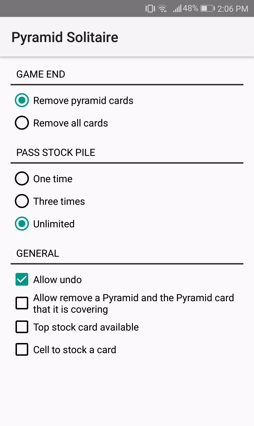 – 玩不同的金字塔纸牌变体:7 行、6 行 + 6 张万能牌、7 行 + 7 张万能牌