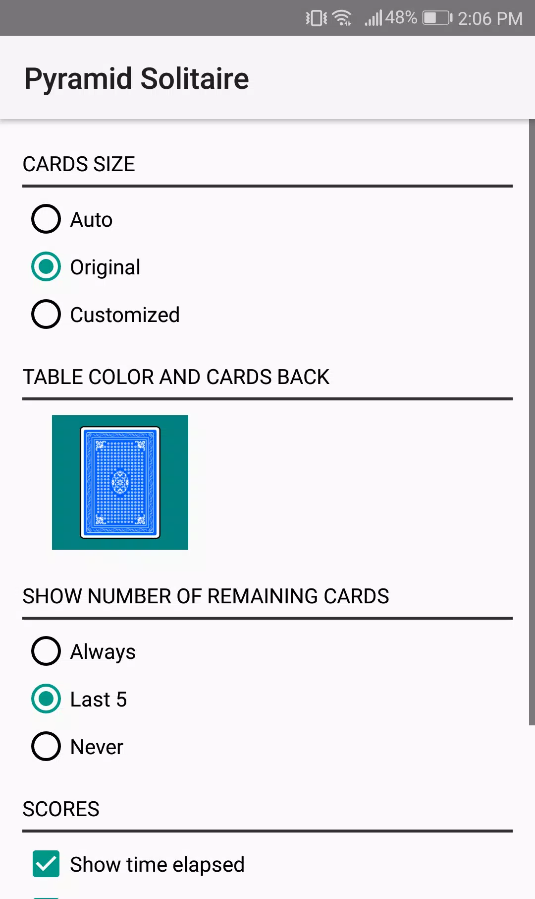 – 设置:纸牌大小、纸牌背面颜色、声音、记分牌、牌桌颜色和分数颜色等