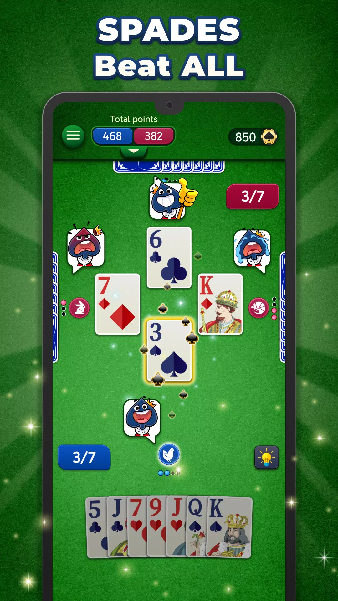 ♠ 在这款四人卡牌游戏中,您可以单人或双人模式畅玩黑桃牌局。