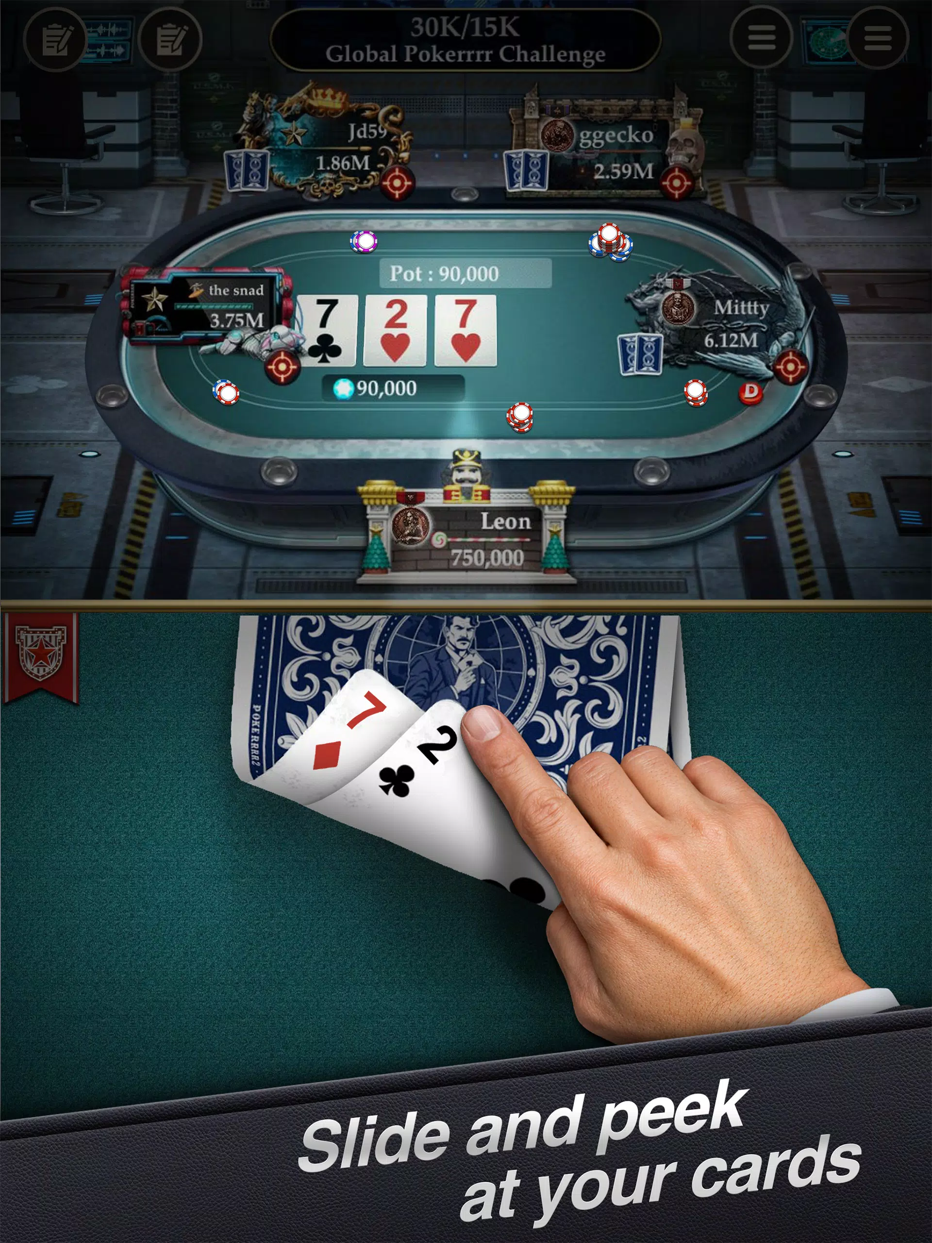 拟真扑克手势 – 眯牌、滑动弃牌、点击过牌,像在真实牌桌上打牌!