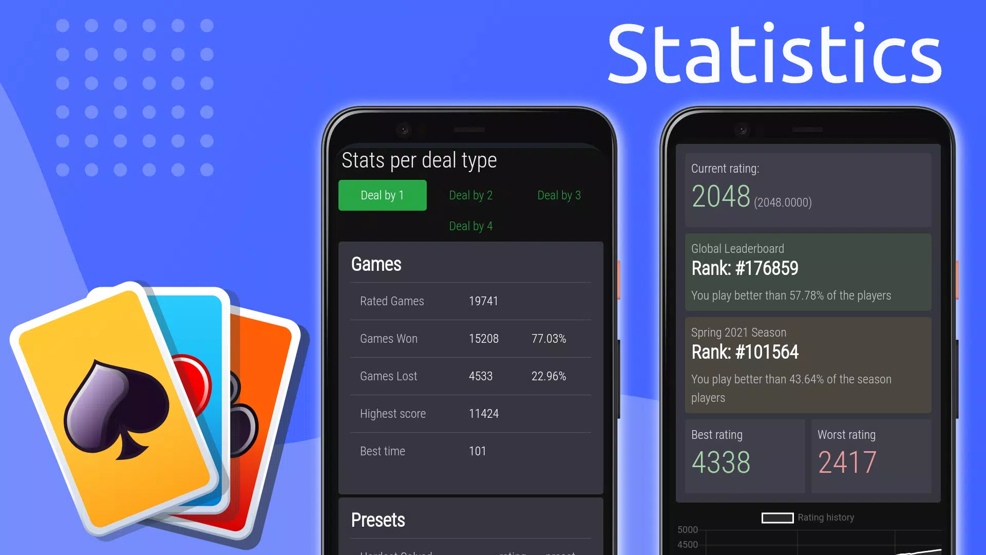 想要竞争或提升成绩?我们的纸牌版本可以计算您的个人评分,让您与其他玩家的表现进行比较。我们分析了数十亿场游戏和成千上万个预设,评分算法与国际象棋相同。