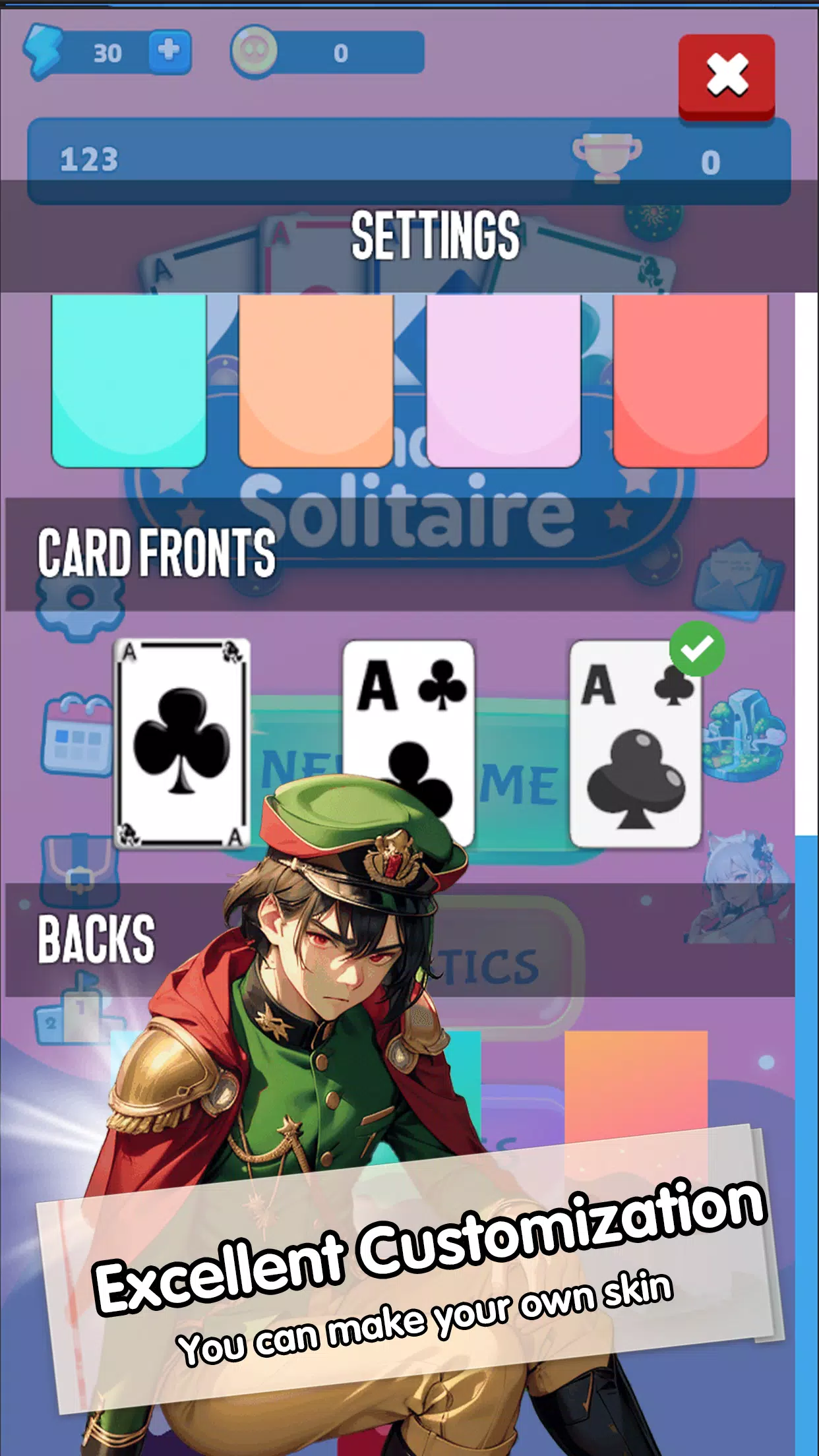 – *可定制皮肤*:使用精美的卡牌背面、正面和鲜艳的背景皮肤,个性化您的游戏体验,让您的纸牌游戏独一无二。