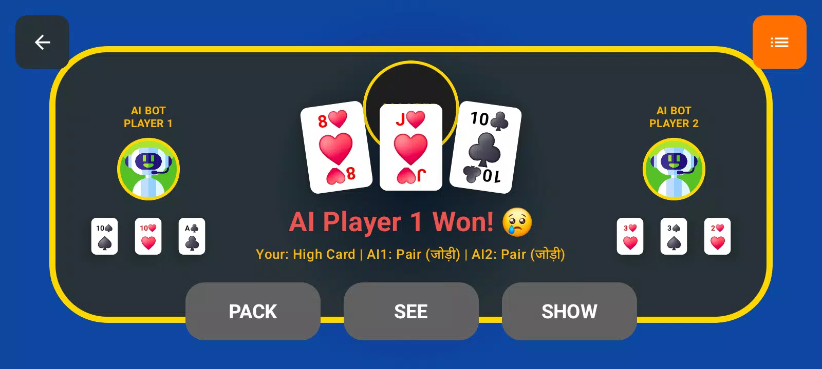 畅玩这款流畅刺激的三张牌策略游戏,完全离线畅玩!挑战智能 AI 对手,考验你的运气,运用“打包”、“查看”和“展示”等策略赢得回合。本游戏纯粹娱乐,不涉及任何真钱交易或赌博。
