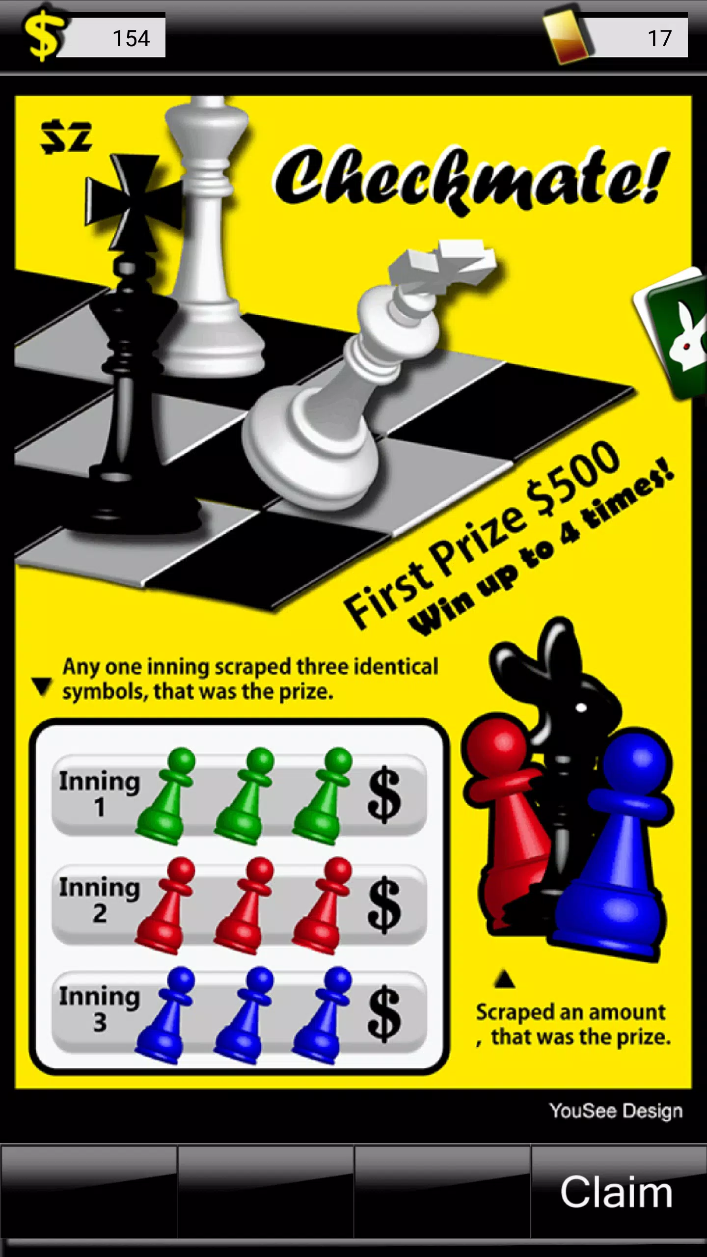 游戏内含彩票刮刮卡,包括:21点扑克刮刮卡、拉霸刮刮卡、俄罗斯轮盘刮刮卡、西洋棋刮刮卡、777刮刮卡等各式卡片。