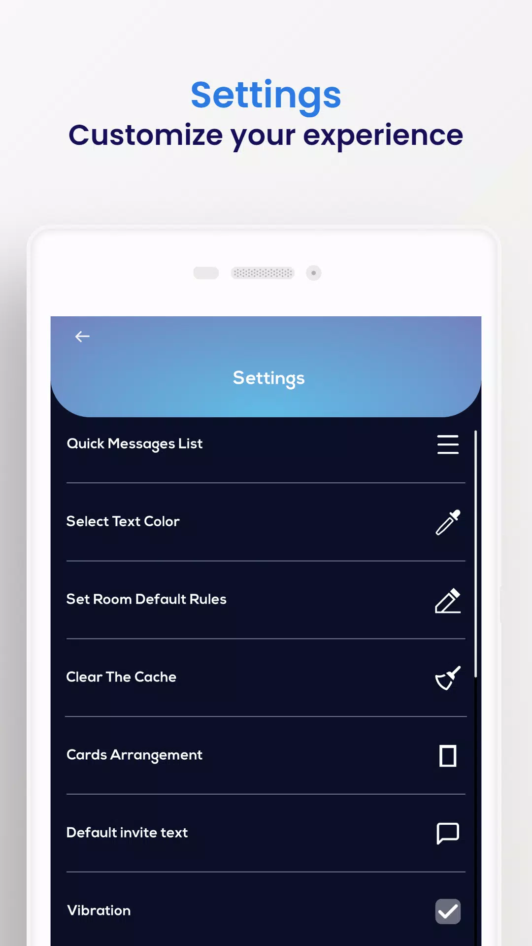– 为您的房间设置自定义规则,例如时间限制、回合数、聊天等。