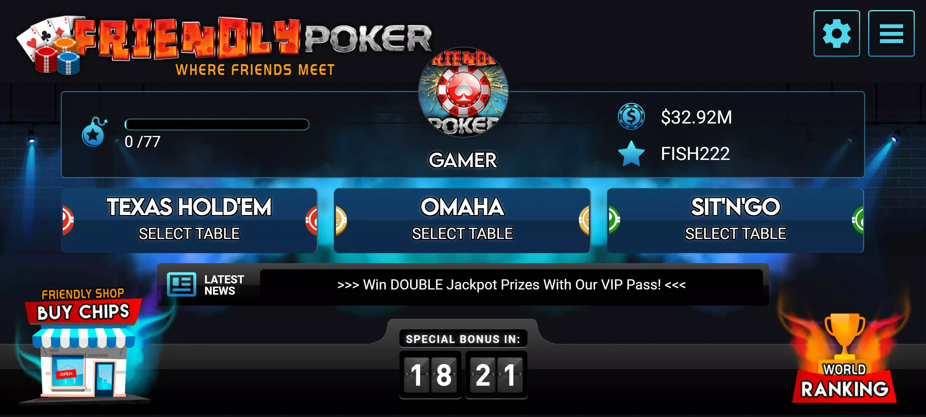 在Friendly Poker中一路奋战,晋级顶尖行列,成为世界冠军!