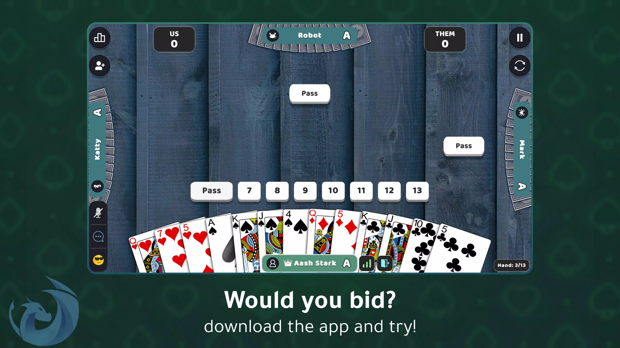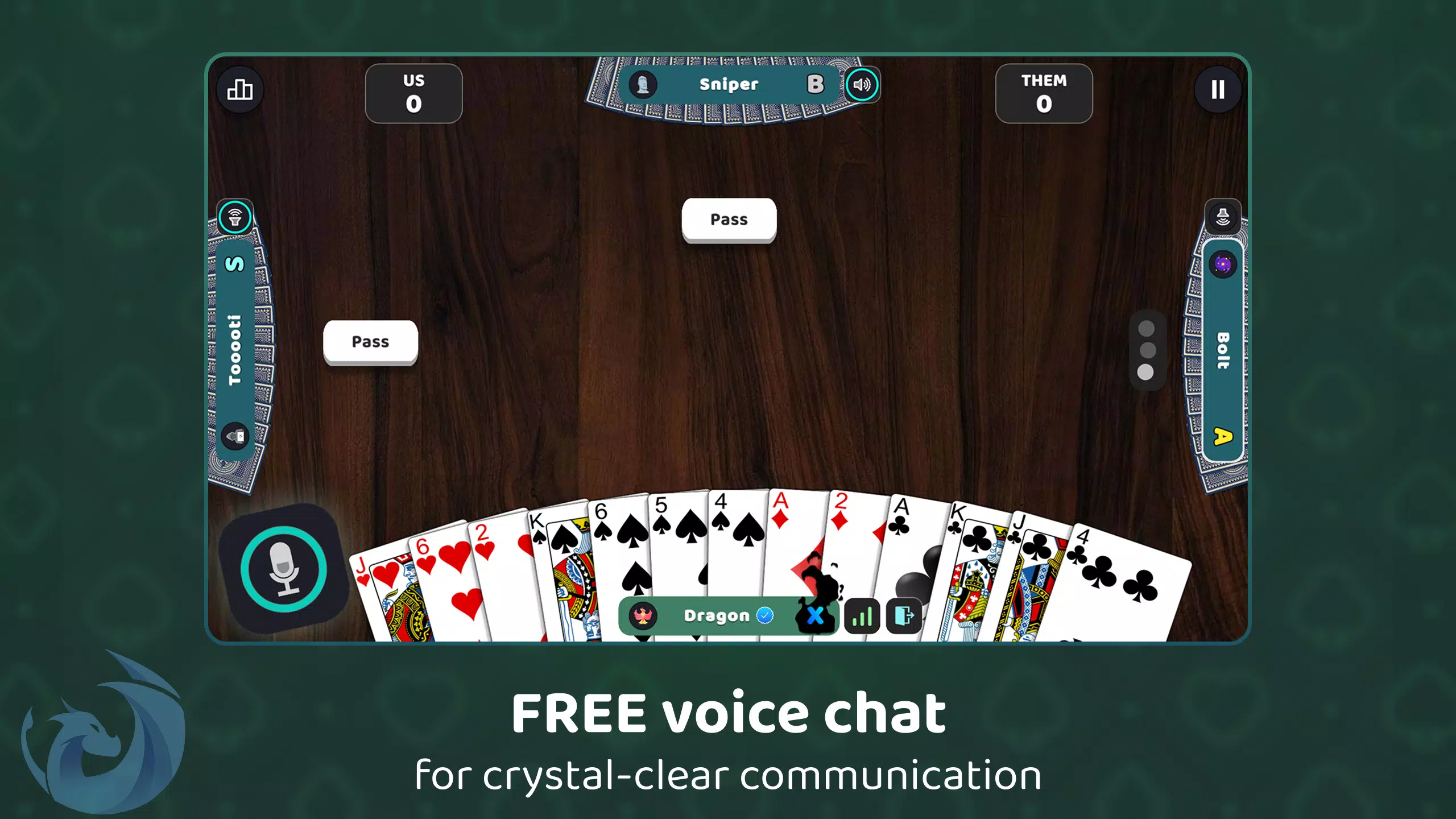 真正的伙伴关系因沟通而闪耀!在休闲的在线聊天室中,使用清晰的免费语音聊天与您的伙伴协调叫牌和战术。或者,使用无限量的文字聊天和富有表现力的表情符号,分享每一手精彩牌局的兴奋之情。