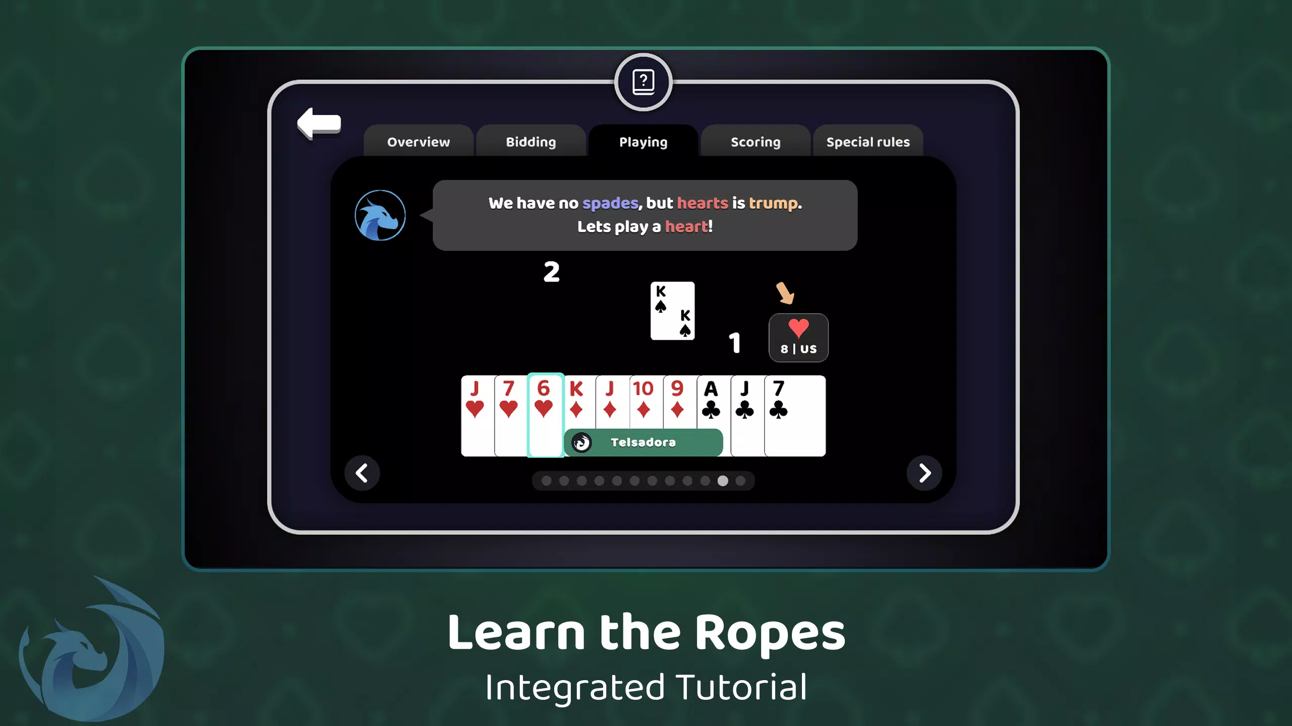 无论您是惠斯特新手,还是想要完善策略,我们清晰全面的应用内教程都能让您直观有趣地掌握叫牌、将牌和吃墩的技巧。