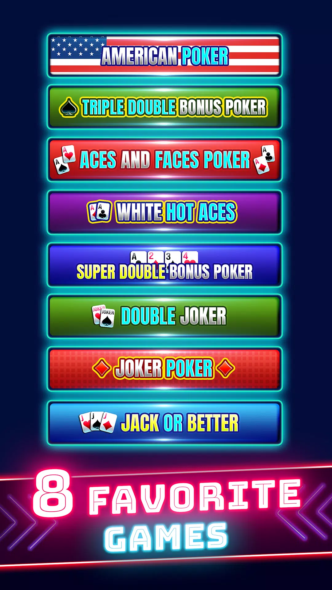 – 1 个赌场应用包含 8 种视频扑克游戏变体:经典 Jacks or Better、Aces & Faces、Joker Poker、Super Double Bonus Poker、Triple Double Bonus Poker、Double Joker、White Hot Aces 和 American Poker!