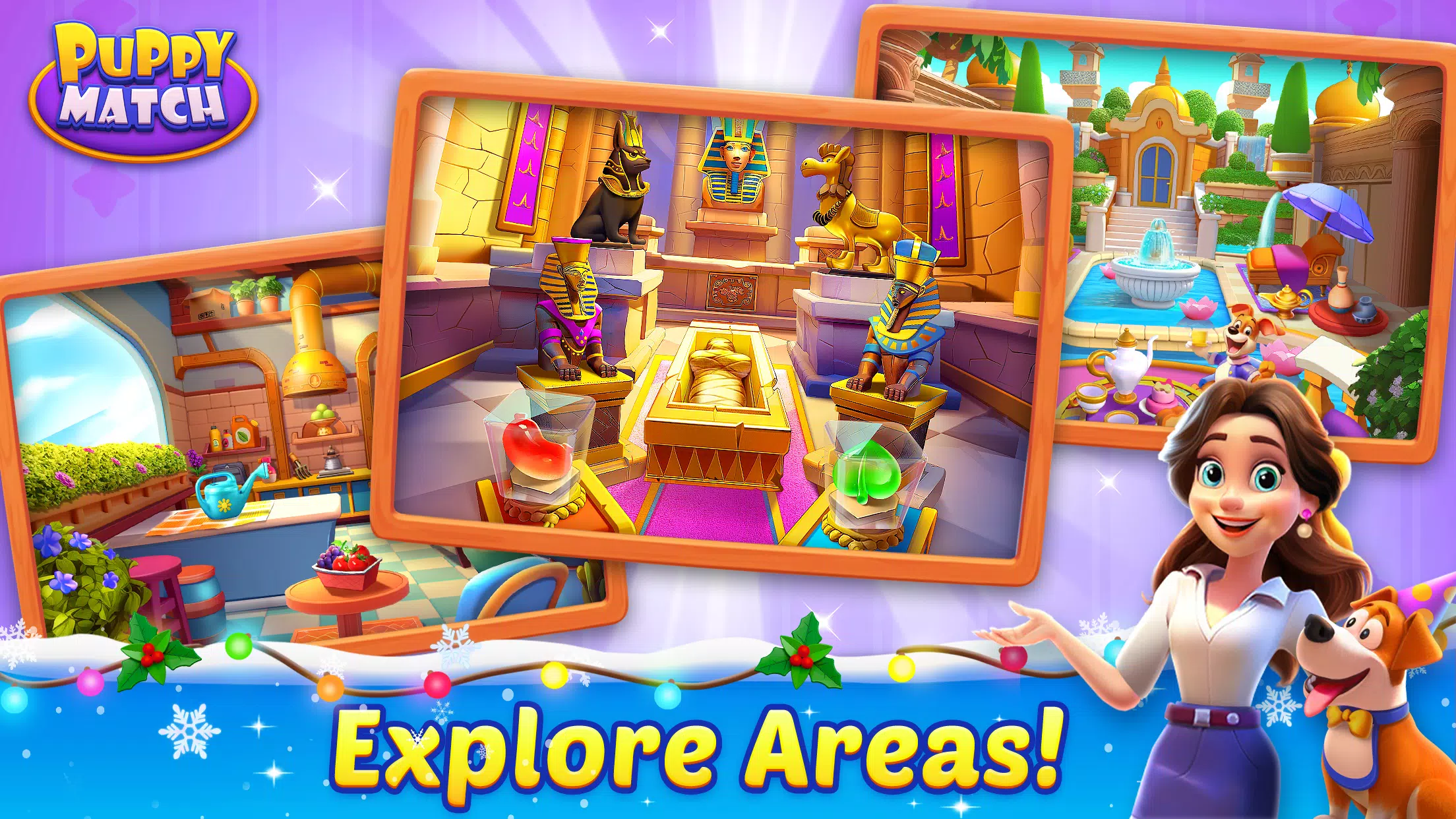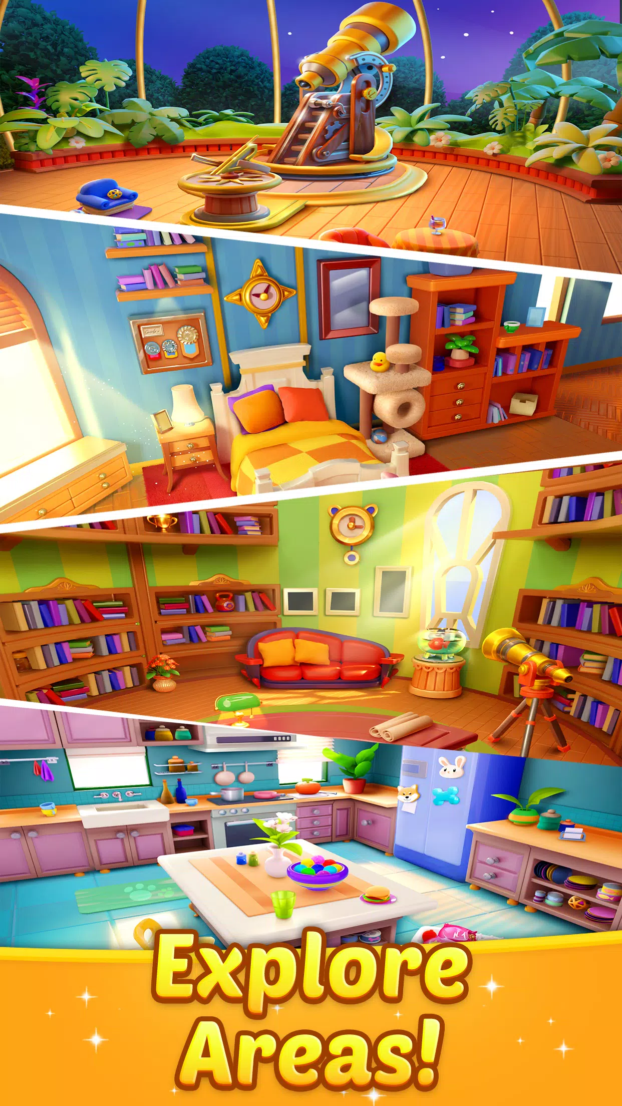 – 在《小狗消消乐》中探索新房间,解锁新区域。通过三消关卡后,新区域将解锁。
