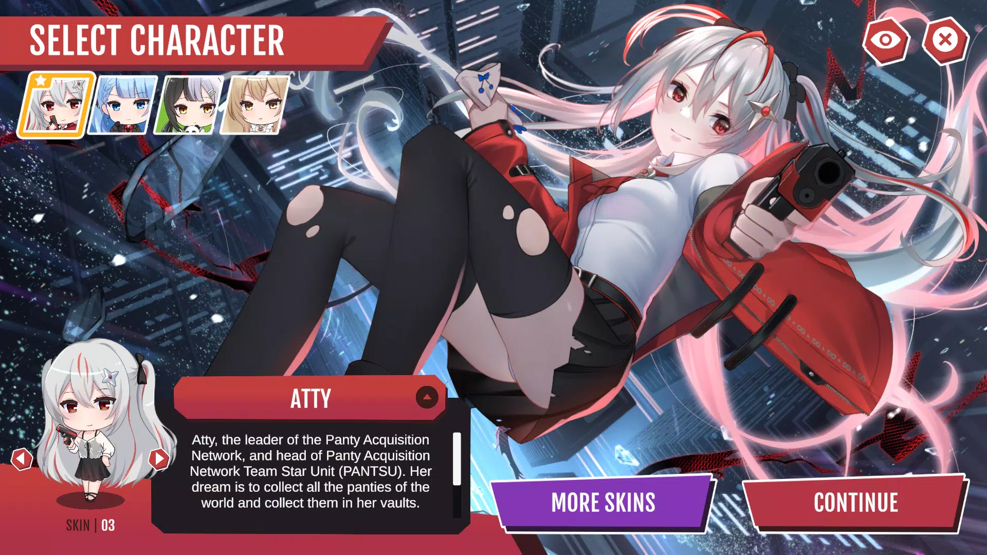 Atty 和她的朋友 Mizu、Sasa 和 Rikki 运用各种技巧和技能来寻找和收集内裤。在 Atty 的秘密基地中提升等级,解锁更多等级和自定义角色。帮助阻止盗贼从秘密基地窃取珍贵的战利品。