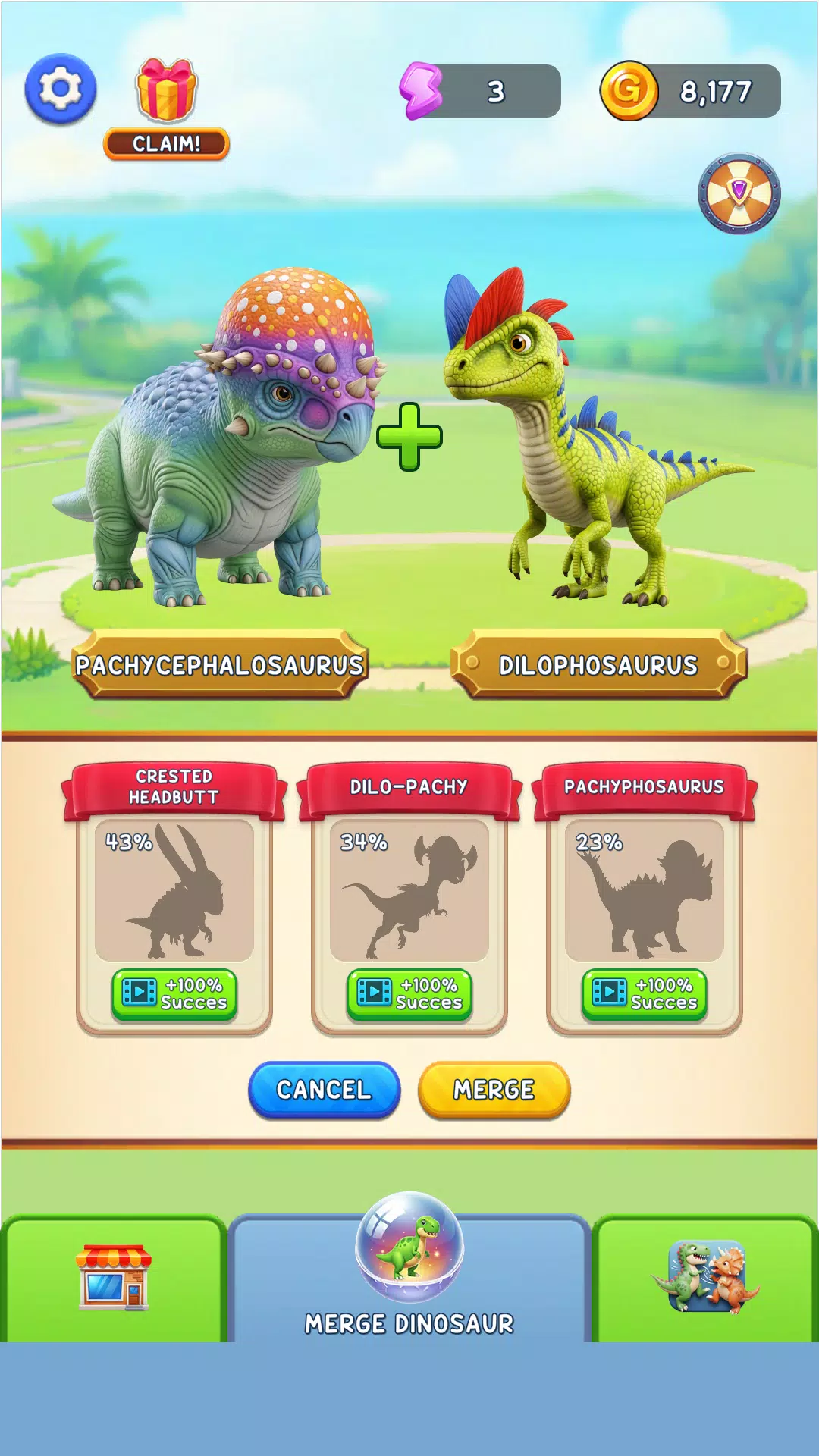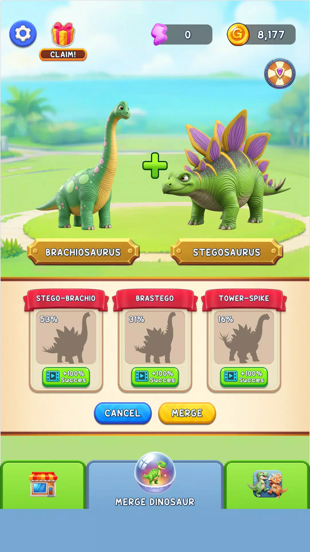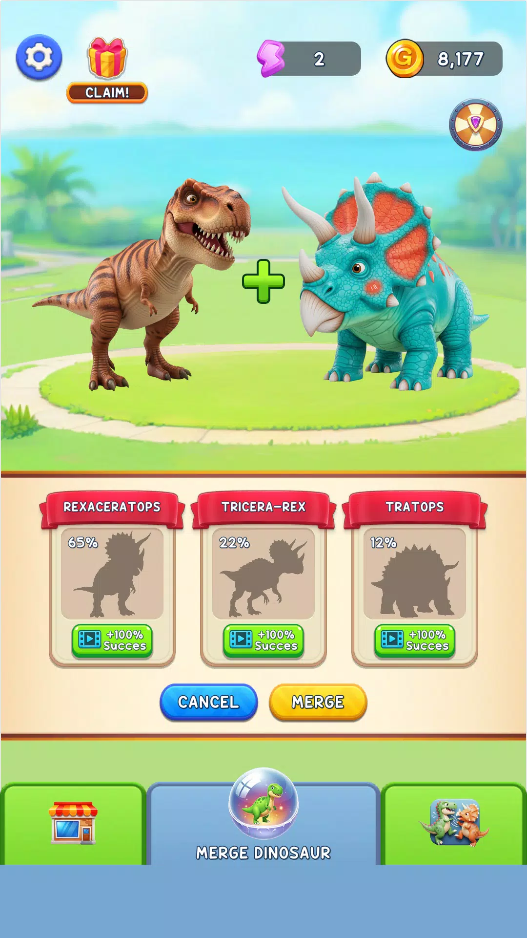 • 发现与收集:探索海量的恐龙组合库。每次合并都充满惊喜!你能解锁所有稀有和传奇的恐龙杂交品种吗?