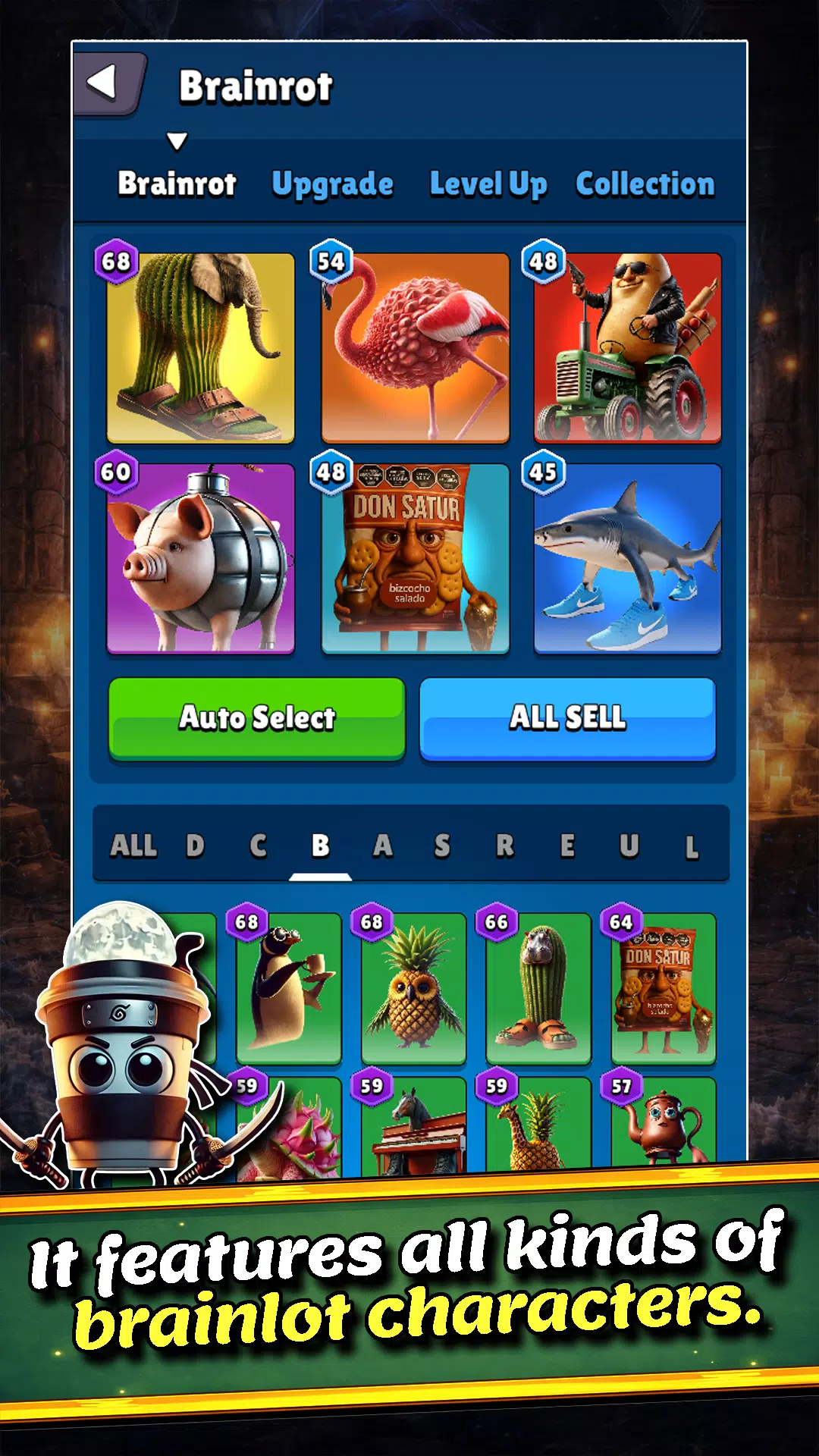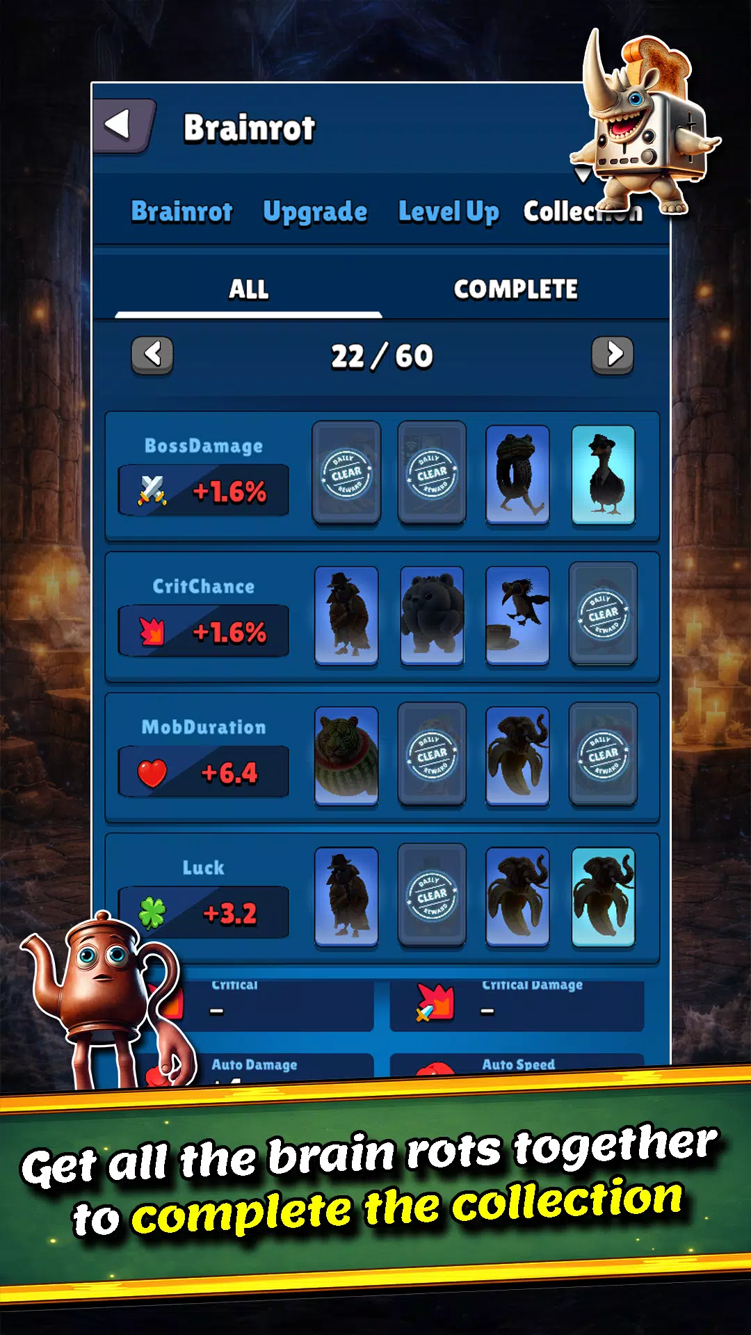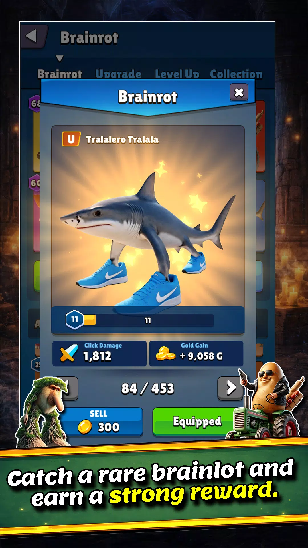 邂逅你最爱的脑腐角色,按等级分类!从普通到超稀有,你收集并装备的每个角色都能大幅提升你的点击伤害。收集得越多,你就越强大。你能集齐所有脑腐角色吗?
