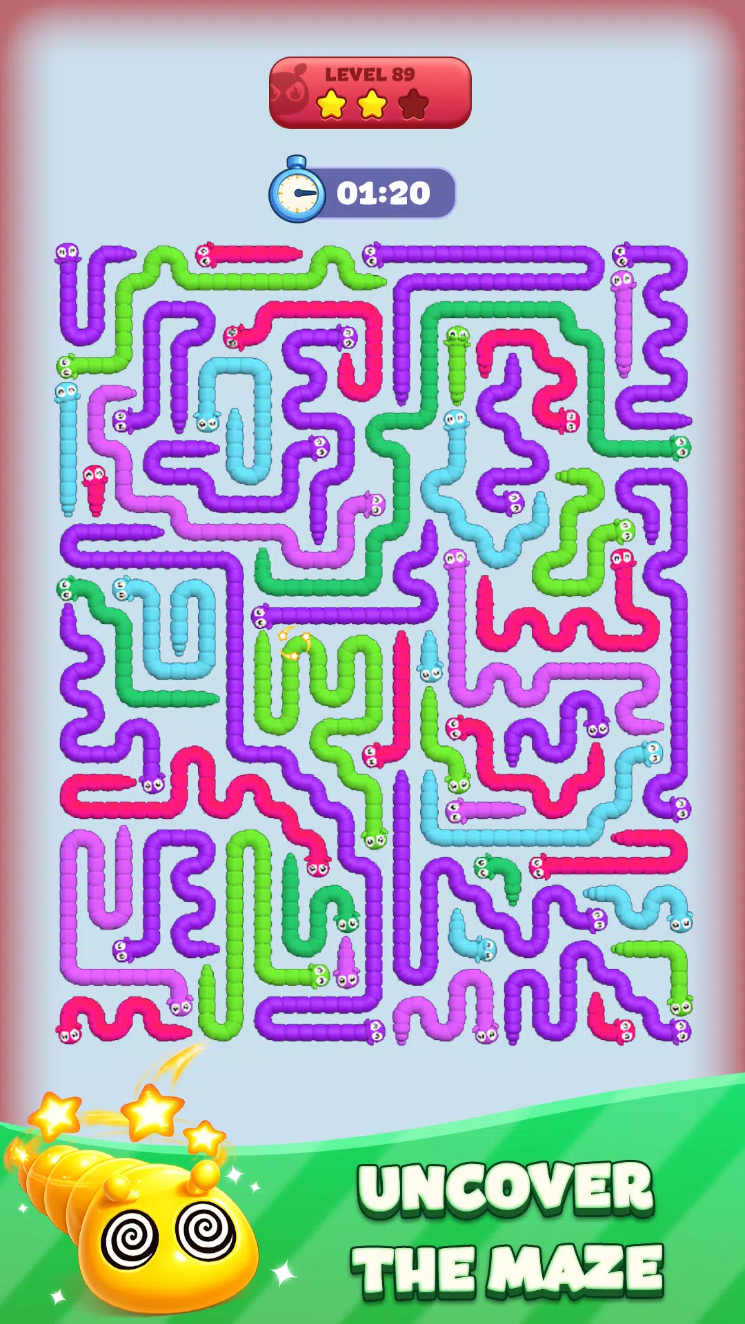 游戏的进度设计旨在帮助你学习。早期关卡教授箭头移动和迷宫阅读的基础知识。随着游戏的进行,谜题会增加更多的蠕虫、更长的路径和更狭窄的空间。后期关卡要求你同时考虑多条路线并规划完整的移动顺序。你将遇到蠕虫共享走廊、彼此靠近并争夺空间的谜题。这些情况需要你运用逻辑思维进行解谜,并谨慎地控制路线。