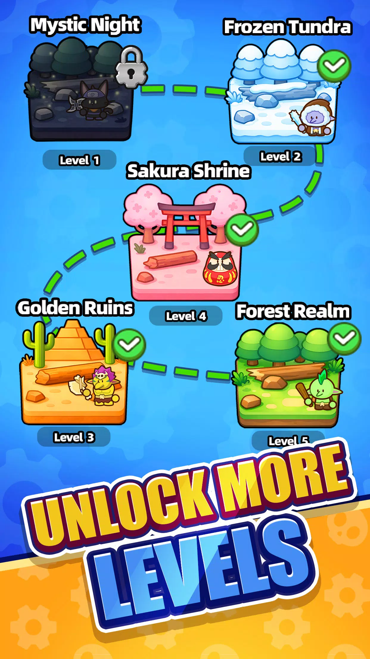 超过 100 个精心设计的关卡,让你对抗狡猾的敌人:布满狡猾陷阱的哥布林、被黑暗魔法诅咒的木乃伊、以及拥有强大力量的雪人……每个敌方阵营都拥有独特的攻击模式,战场范围从狭窄的峡谷到广阔的平原。每一次兵力组合都可能成为你的制胜之策。