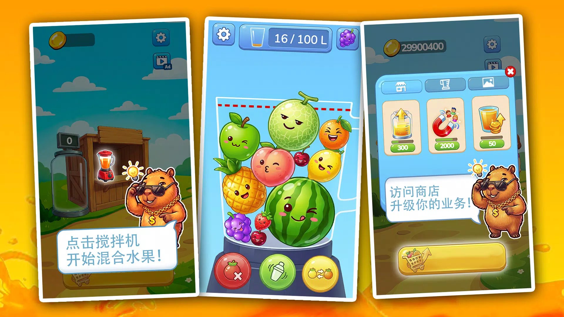通过合成不同水果,制作新的饮品并提升售价。简单直观的 合并游戏 机制,轻松上手,玩起来十分解压。