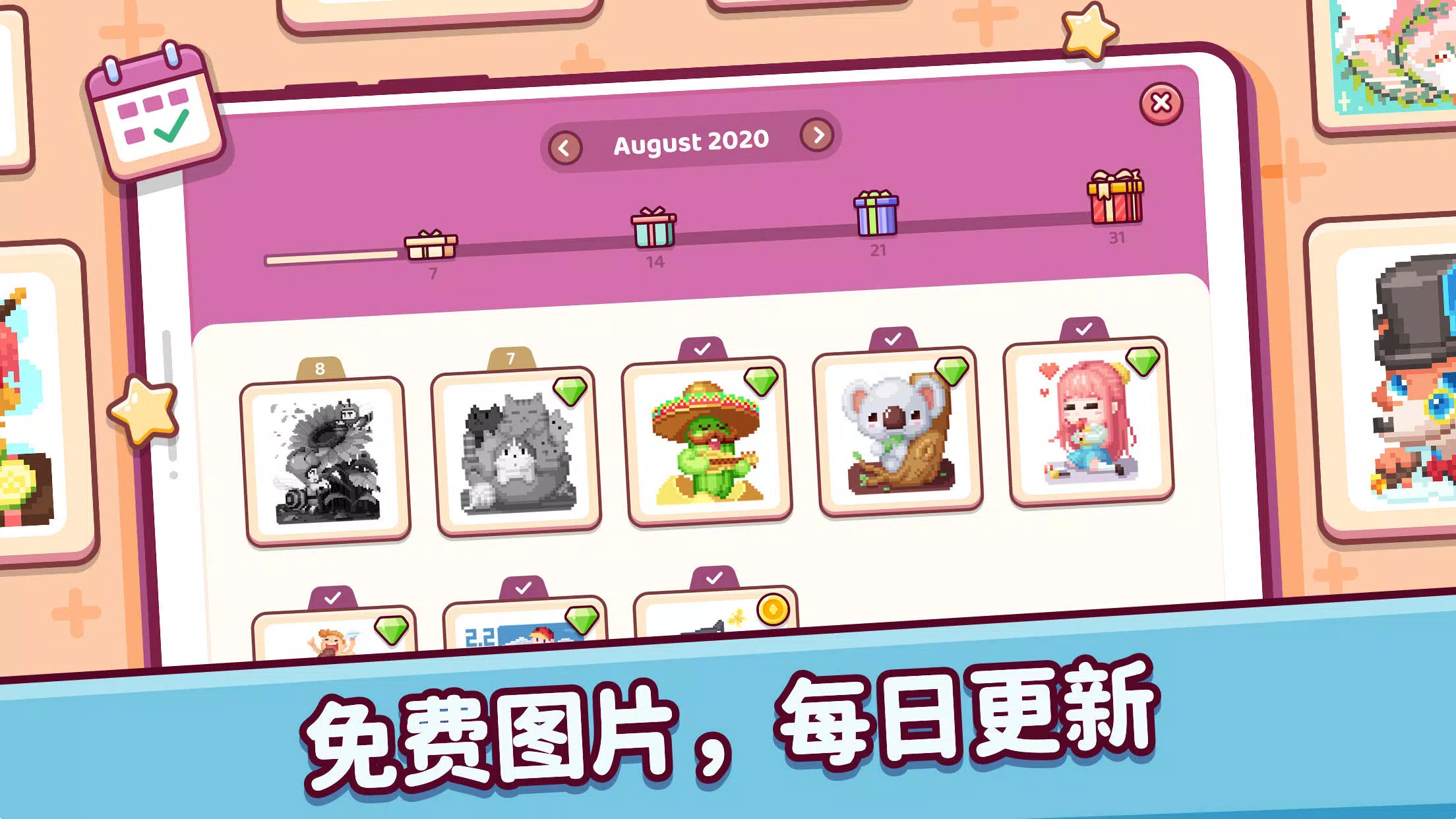 Pixel.Fun2是一款独特的像素填色游戏,你可以选择按小岛填色,感受填色和组合的乐趣,或者按图片分类填色,完成你喜爱的像素图片。