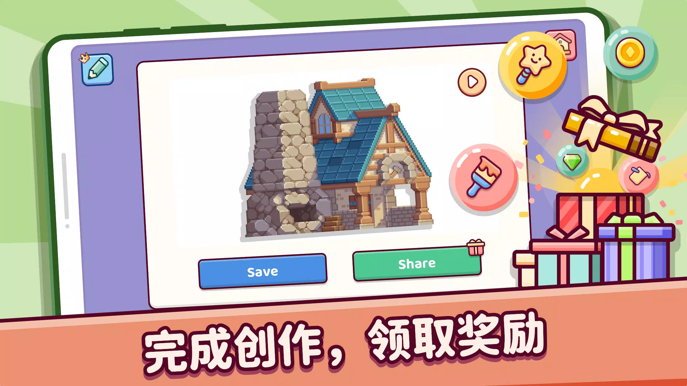 小岛上的房子、汽车、鲜花、小动物、男孩儿女孩儿们,都可以逐一填色。你的每一次创作,都在为最终的彩色小岛添砖加瓦。通过短视频,就能轻松将作品与家人和朋友分享!