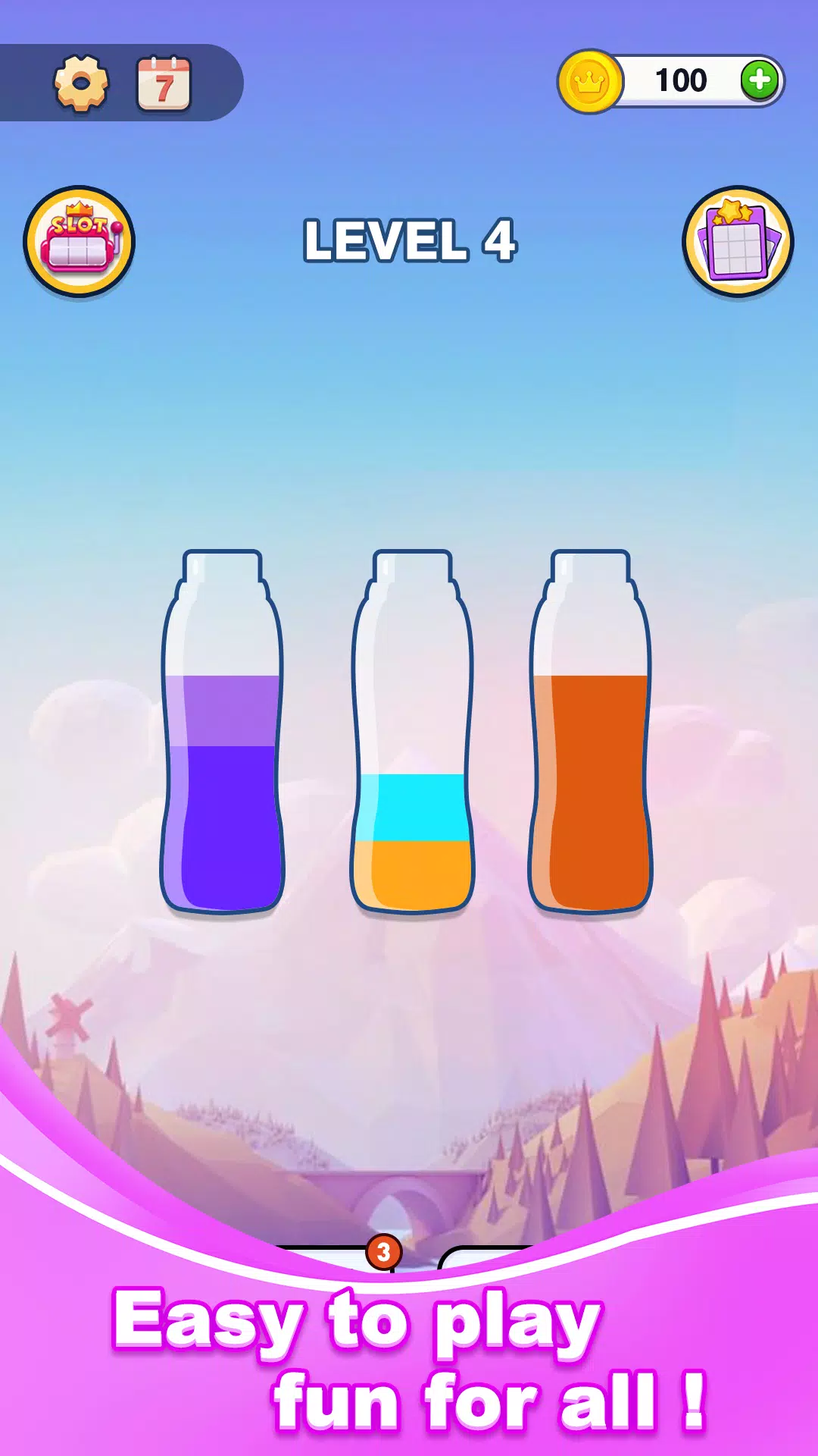 当每个瓶子都装满一种颜色时,即可完成关卡