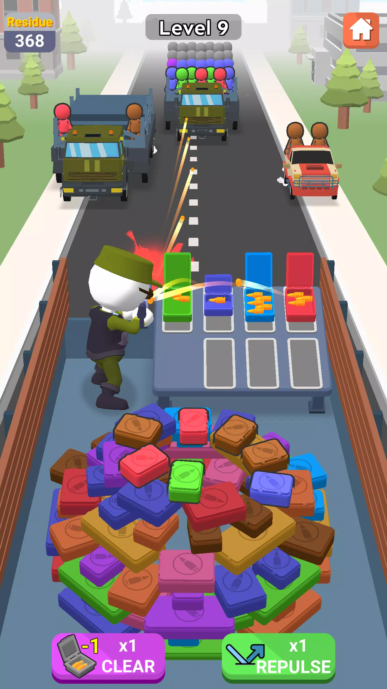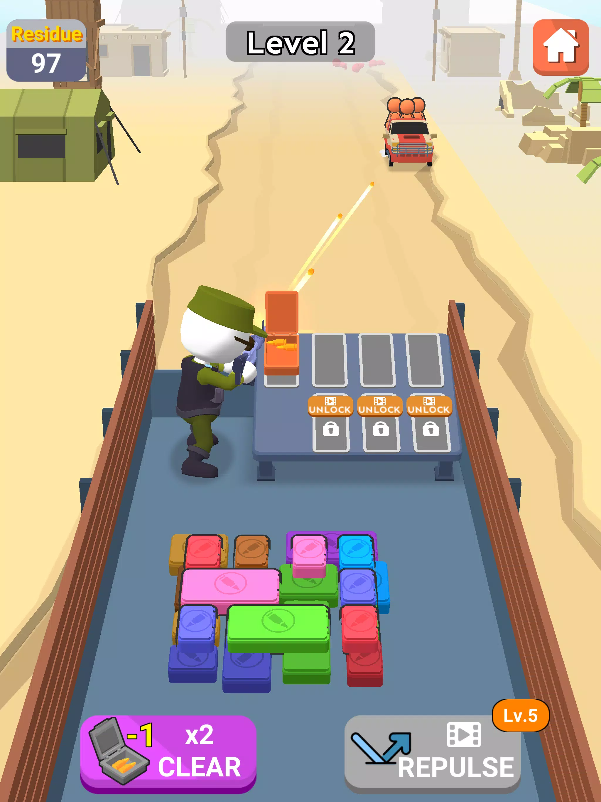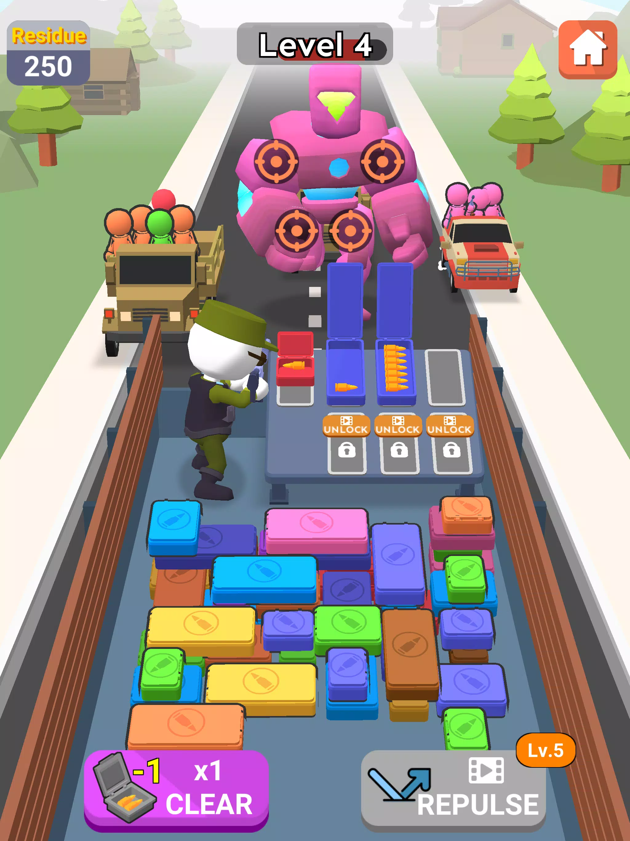 追击射击是一款紧张刺激的益智游戏。游戏中,不同颜色的敌人身影会从你身后追击。你的任务是快速识别敌人的颜色,点击装填与追击者相同颜色的子弹,从而发射子弹消灭追击的敌人。每成功消灭一波敌人,你就离通关更近一步。只有巧妙应对,消灭所有敌人,才能顺利通关。快来挑战你的反应速度和判断力吧!