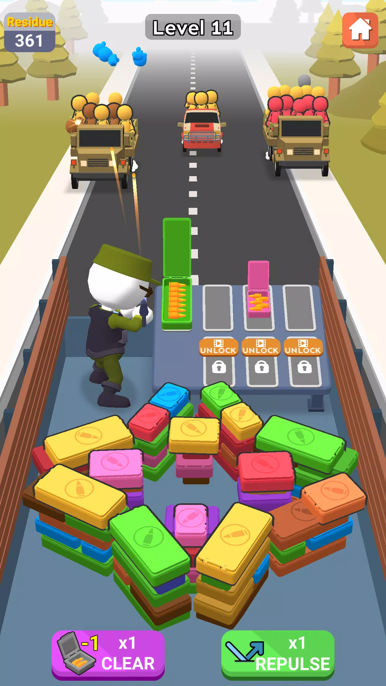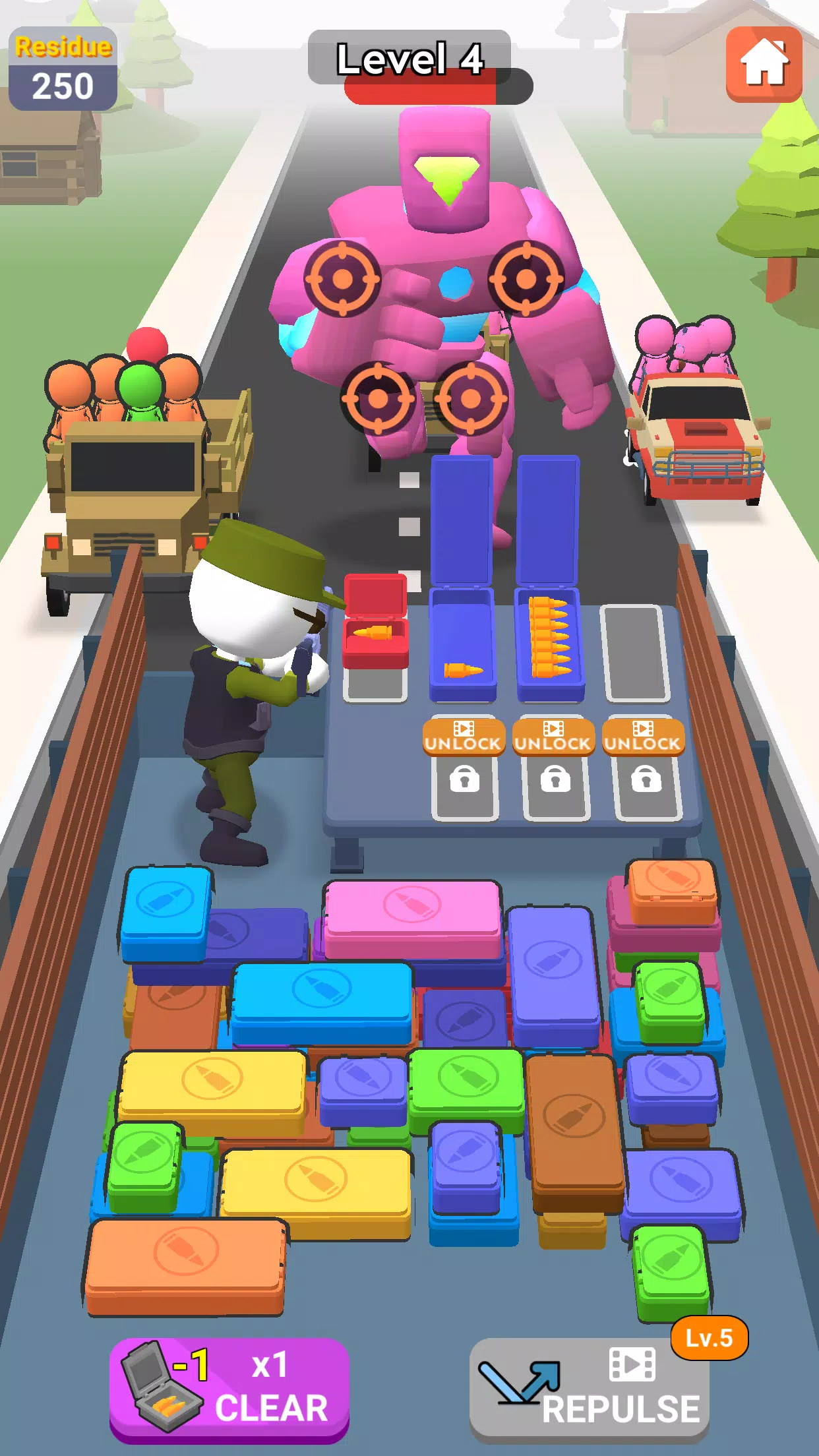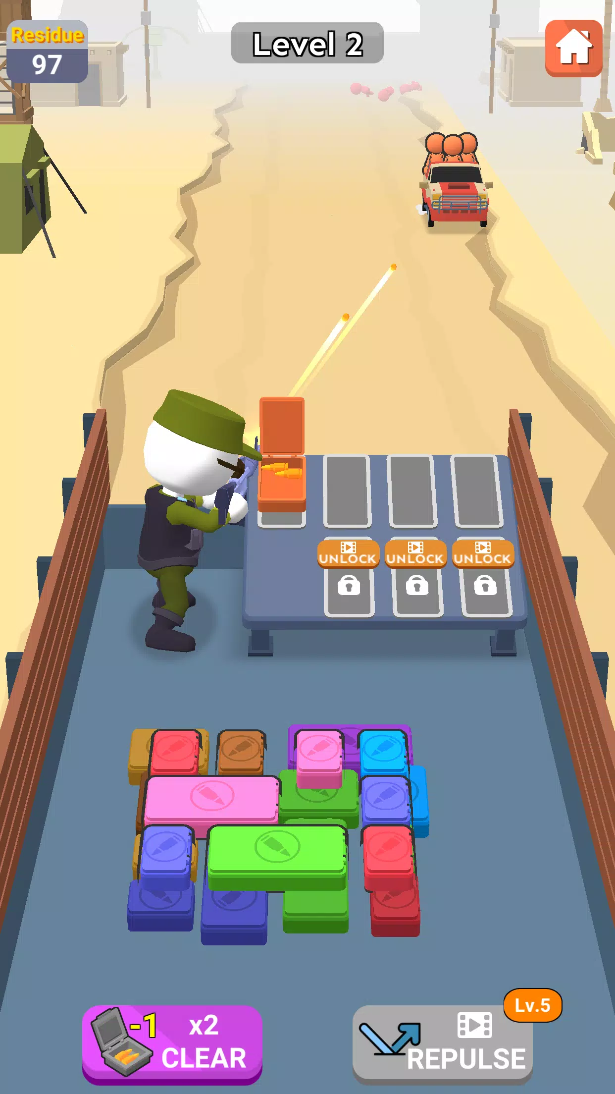 追击射击是一款紧张刺激的益智游戏。游戏中,不同颜色的敌人身影会从你身后追击。你的任务是快速识别敌人的颜色,点击装填与追击者相同颜色的子弹,从而发射子弹消灭追击的敌人。每成功消灭一波敌人,你就离通关更近一步。只有巧妙应对,消灭所有敌人,才能顺利通关。快来挑战你的反应速度和判断力吧!