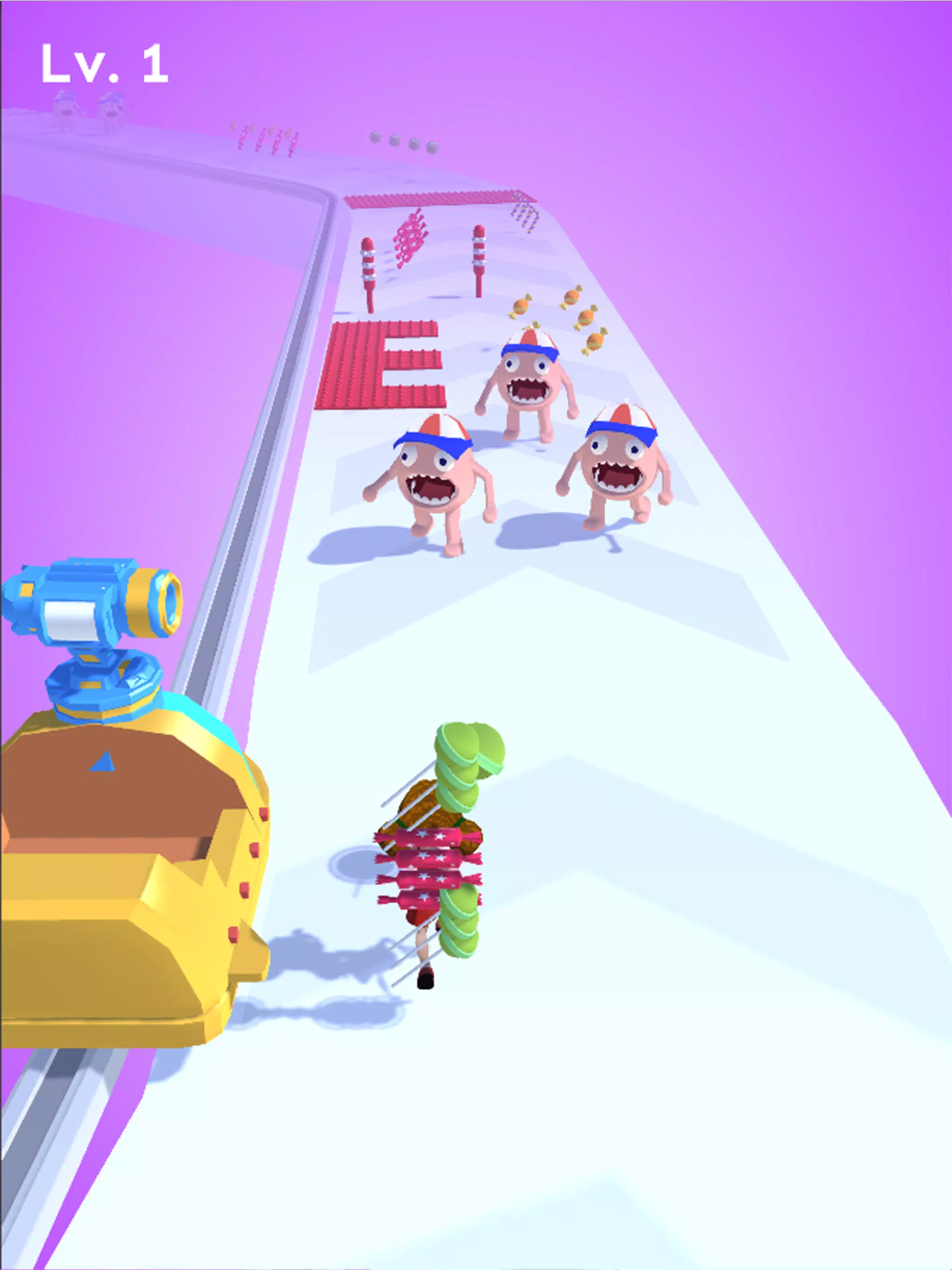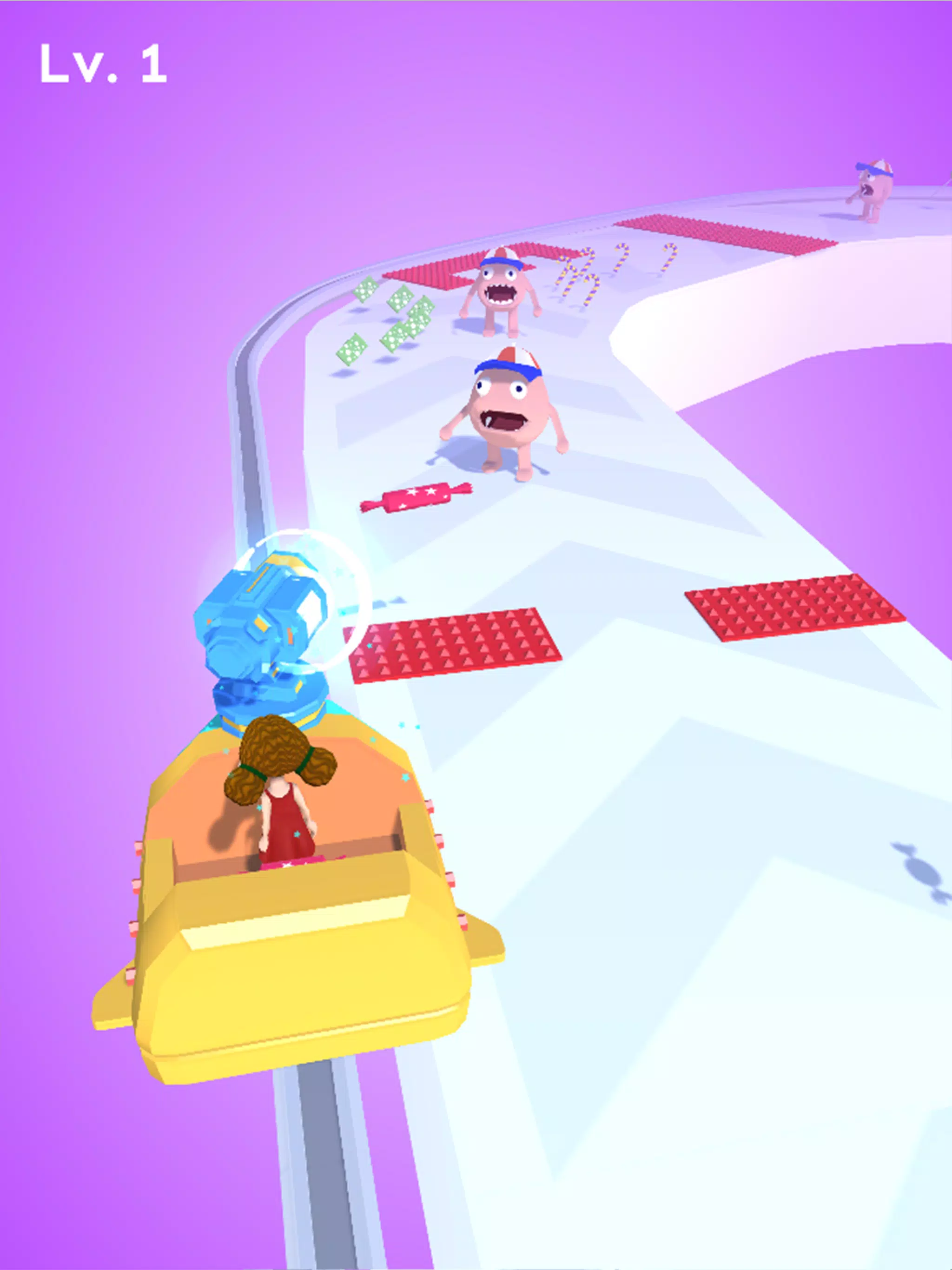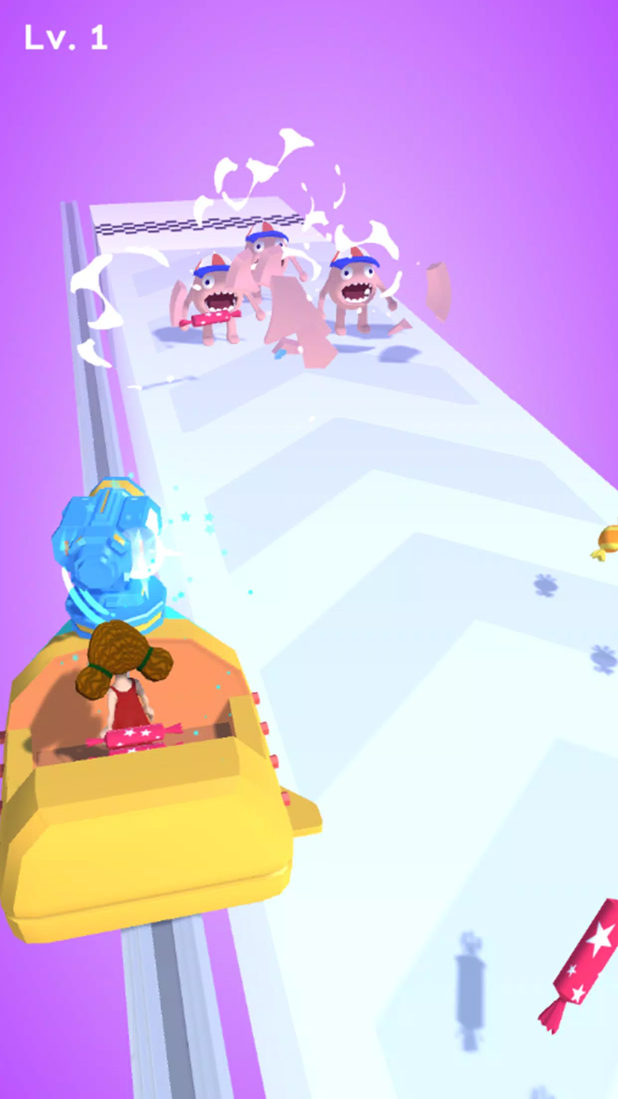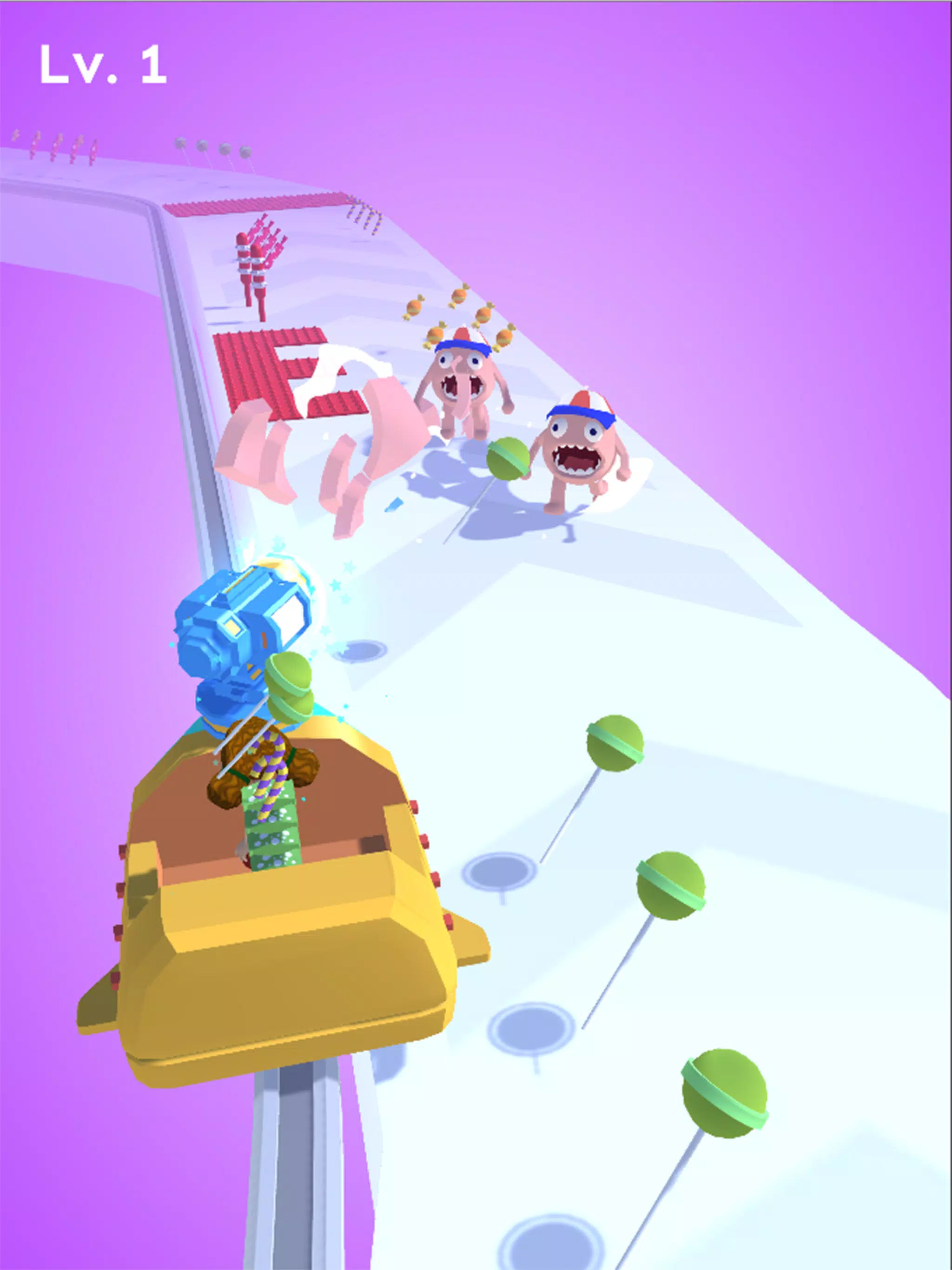 There are many candies and enemies on the road. You need to collect candies. When you encounter enemies, jump on your chariot and use candies to eliminate enemies.