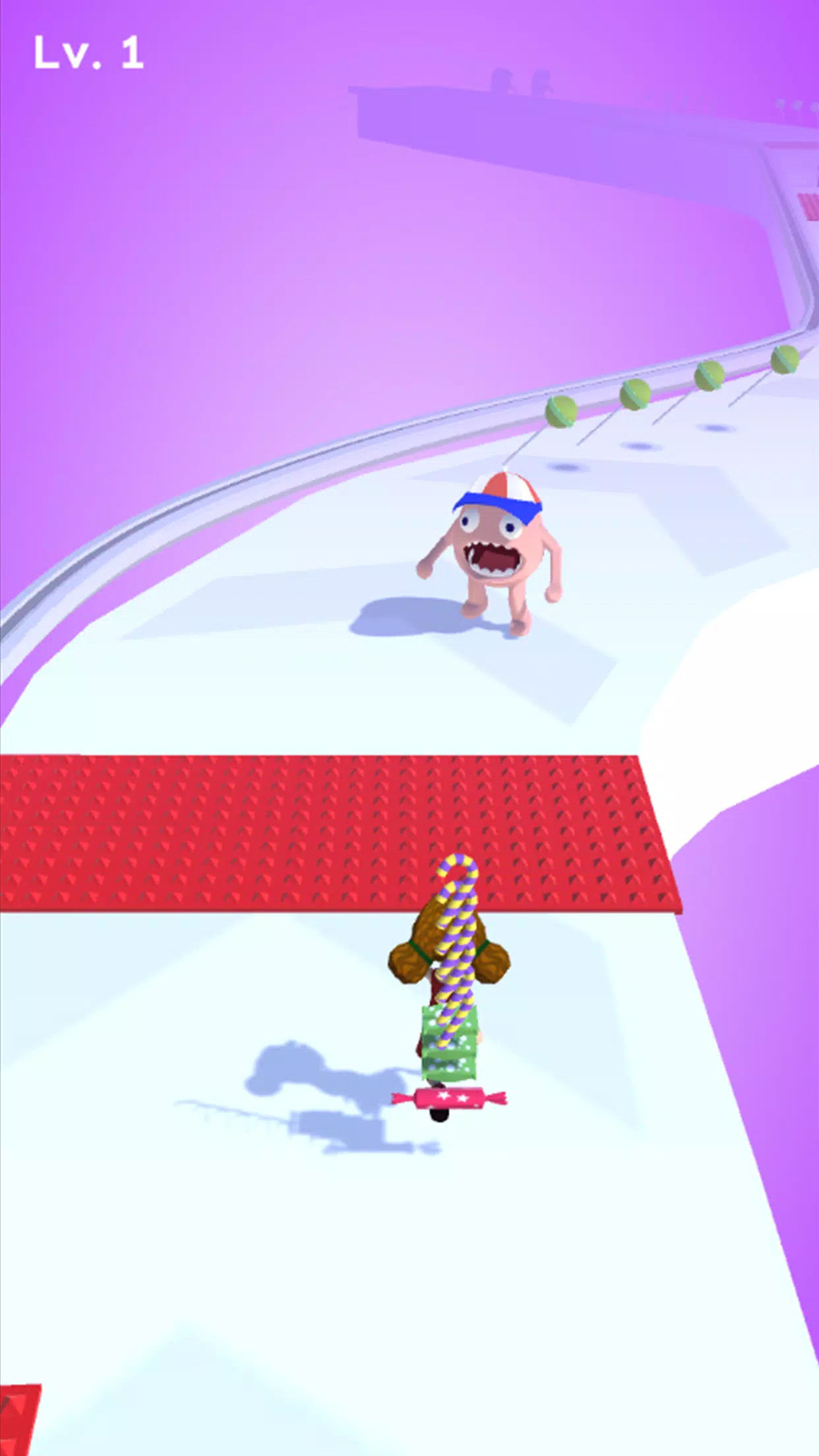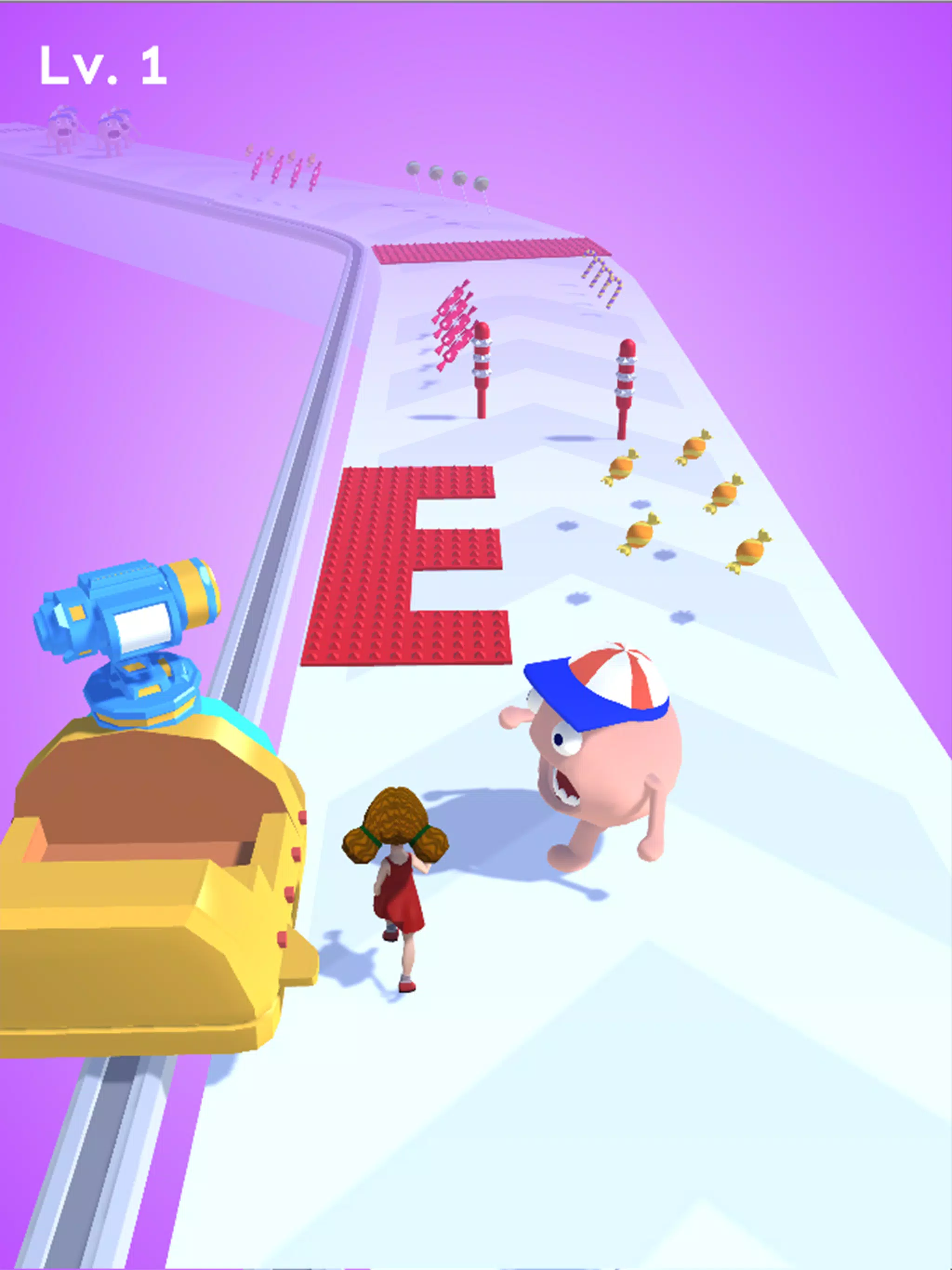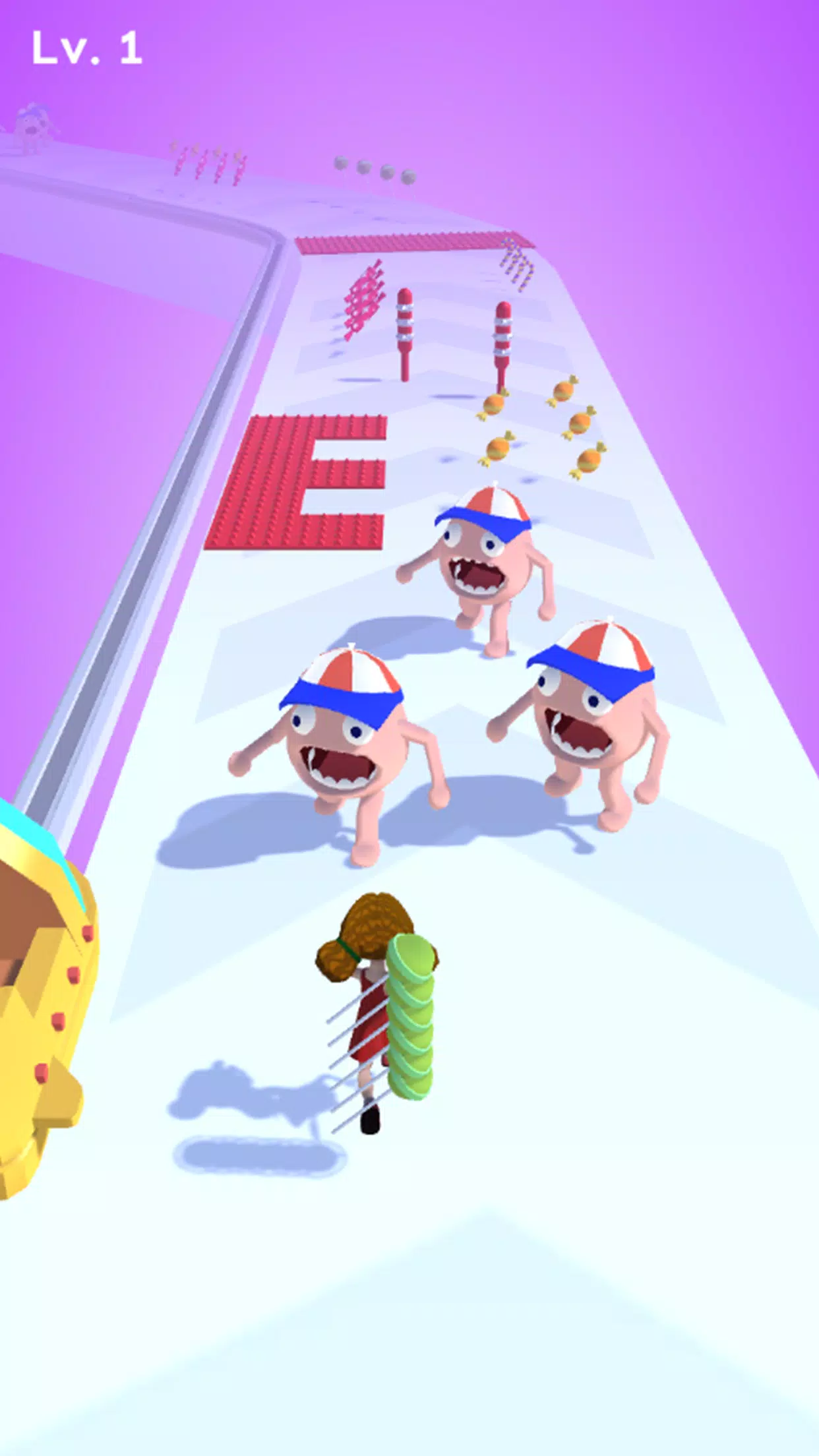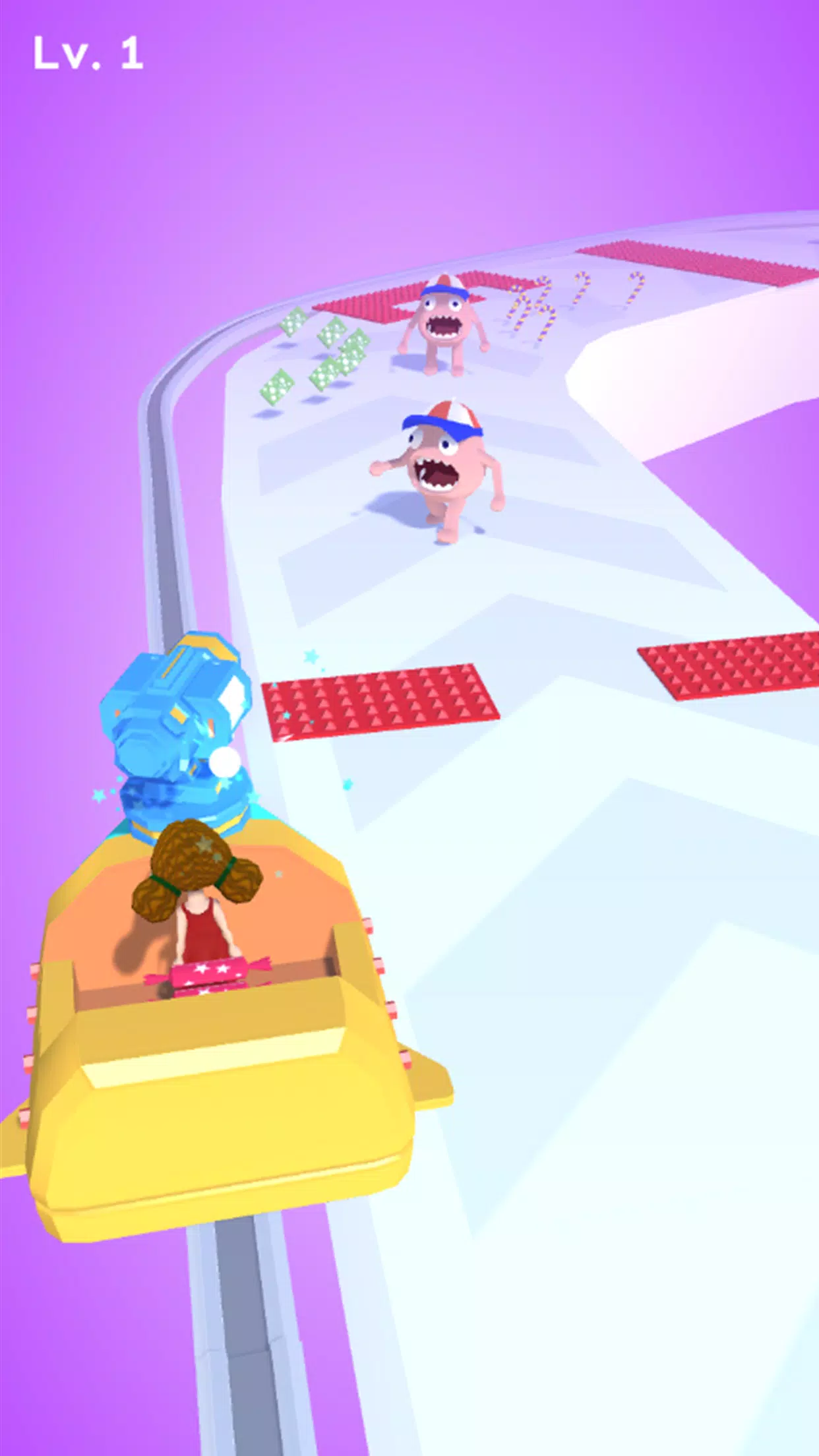 There are many candies and enemies on the road. You need to collect candies. When you encounter enemies, jump on your chariot and use candies to eliminate enemies.